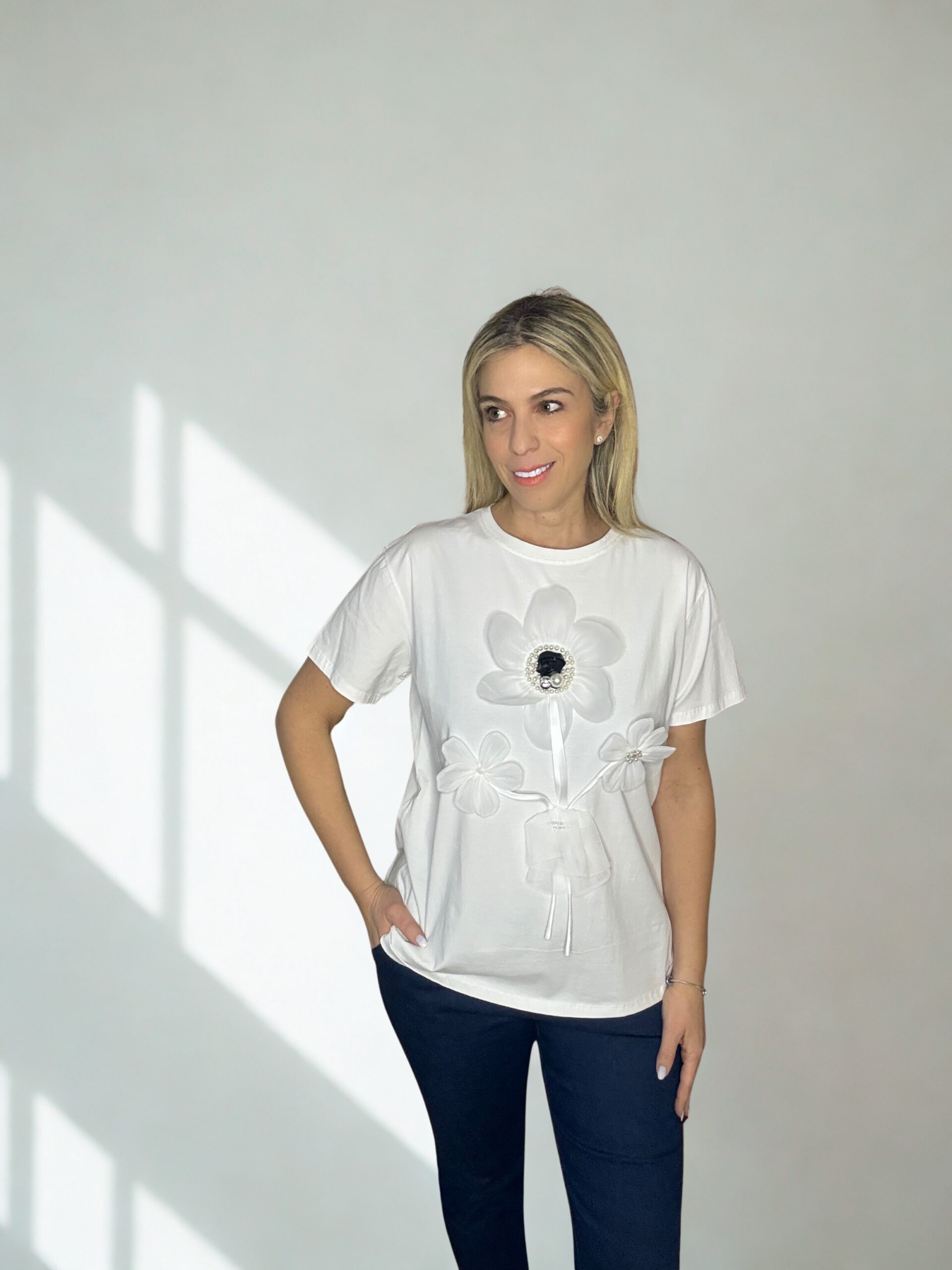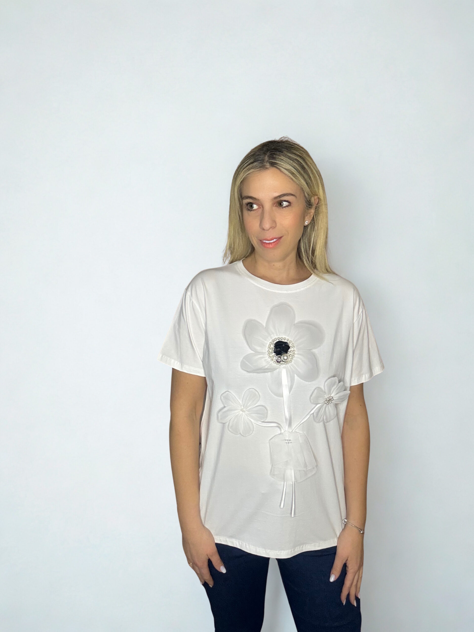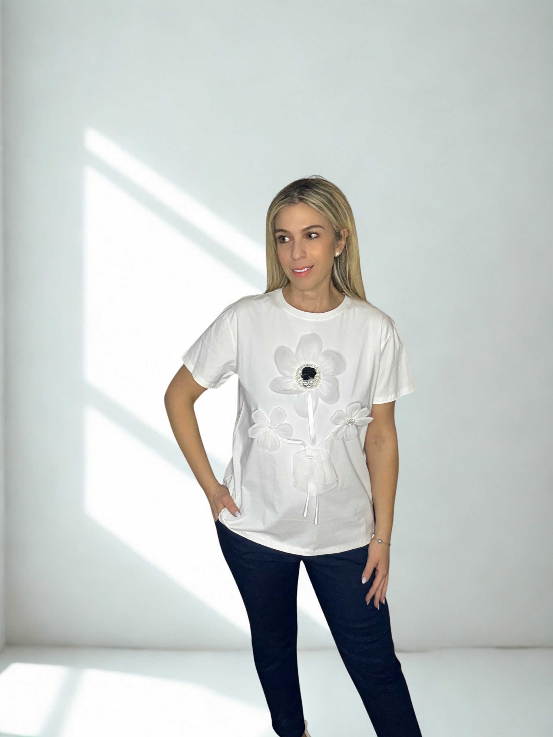 Κομψή και ρομαντική μπλούζα σε άνετη γραμμή, με εντυπωσιακή τρισδιάστατη διακόσμηση λουλουδιών στο μπροστινό μέρος και λαμπερή λεπτομέρεια στο κέντρο. Κατασκευασμένη από απαλό, βαμβακερό ύφασμα με ελαστίνη για άνετη εφαρμογή και ελευθερία κινήσεων. Ιδανική για καθημερινές αλλά και πιο ιδιαίτερες εμφανίσεις, συνδυάζεται εύκολα με jeans, παντελόνια ή φούστες για ένα chic αποτέλεσμα.