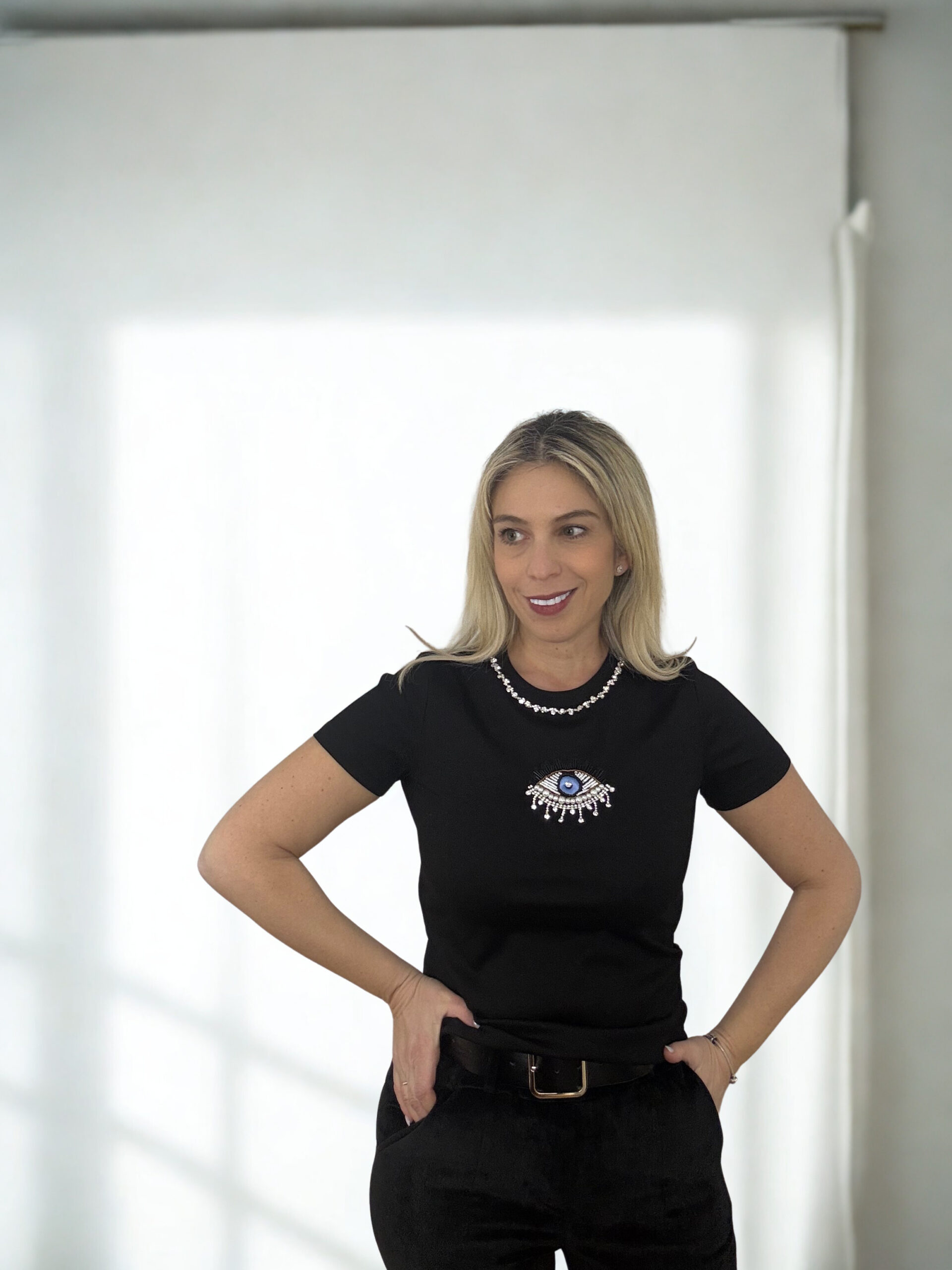 - Μπλούζα με κοντά μανίκια στυλάτη 95% βαμβακερή ,στολισμένη με όμορφα διακοσμητικά απο πέρλες και στρας που σχηματίζουν ενα ιδιαίτερο σχέδιο στο σημείο του στήθους και στην λαιμόκοψη. 65% βαμβακερή και 35% πολυέστερ για να μην τσαλακώνει.