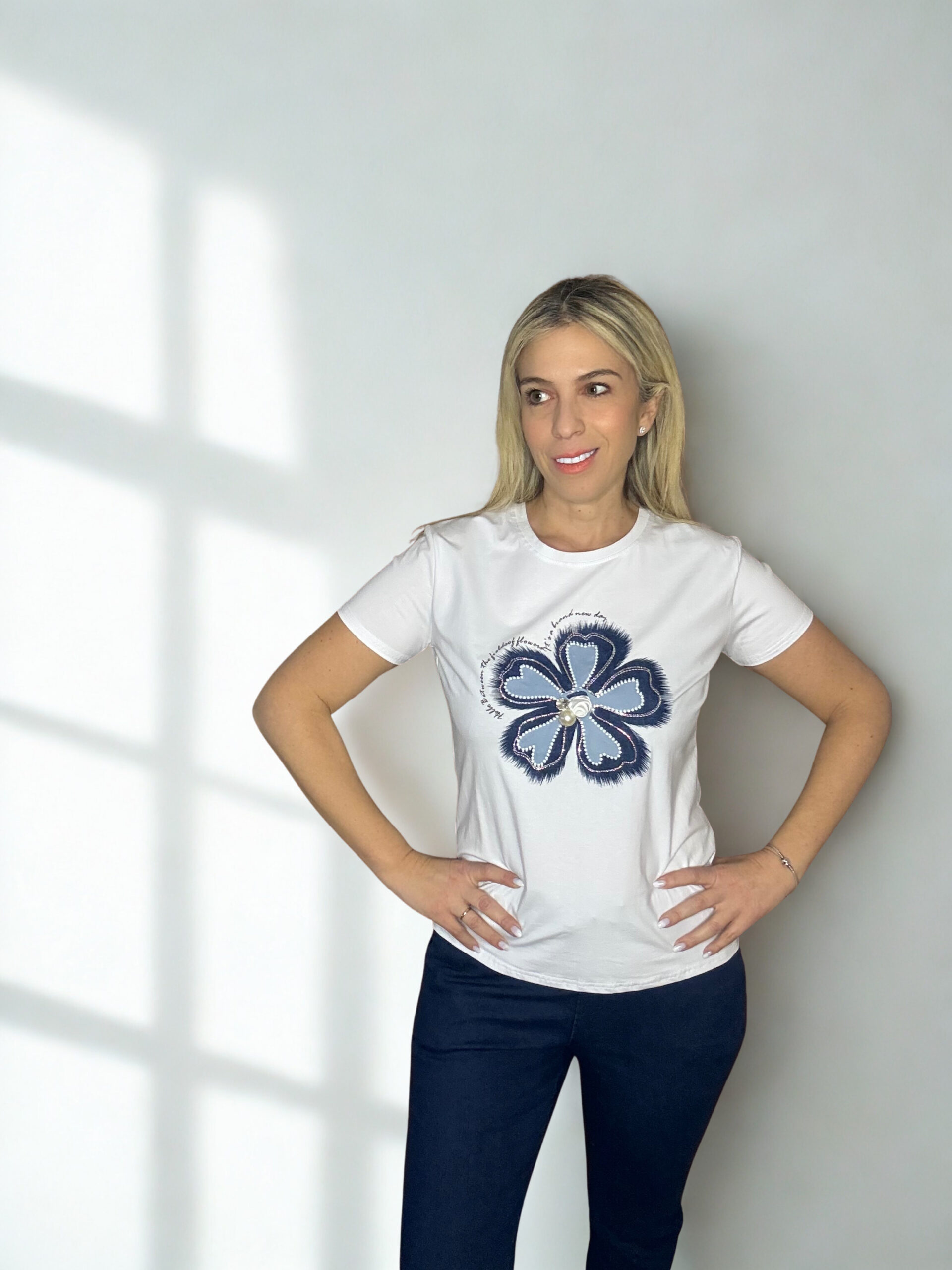 Κομψή και μοντέρνα γυναικεία μπλούζα με εντυπωσιακό floral σχέδιο στο μπροστινό μέρος, διακοσμημένο με λεπτομέρειες που προσθέτουν λάμψη και θηλυκό χαρακτήρα. Ιδανική για casual αλλά και πιο προσεγμένες εμφανίσεις, χαρίζει στυλ και φρεσκάδα σε κάθε outfit.