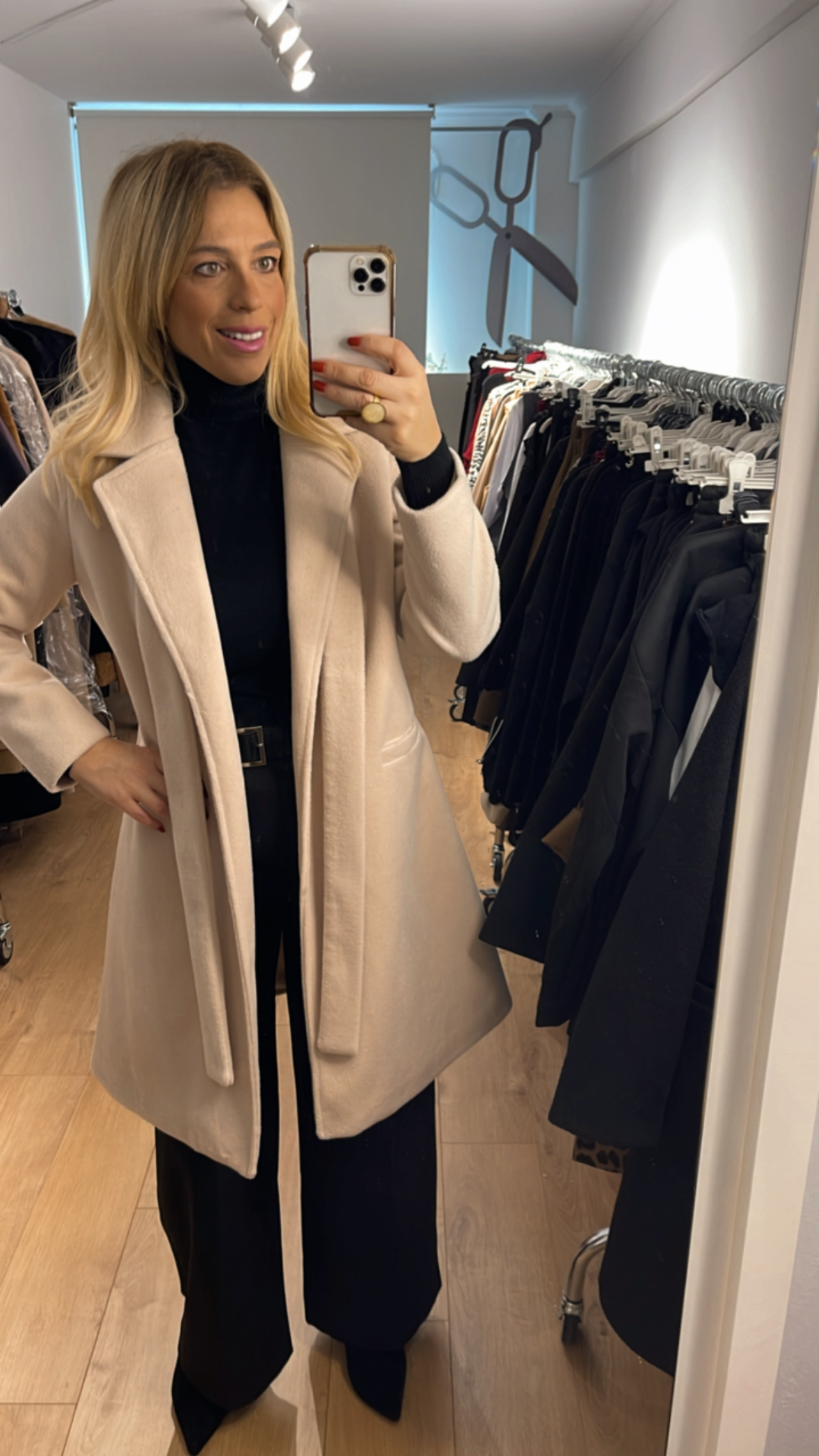 - Κομψό κοντό παλτό σε μπεζ απόχρωση ,κατασκευασμένο από υψηλής ποιότητας ύφασμα που προσφέρει ζεστασιά και άνεση, προσδίδοντας μια πολυτελή αίσθηση .Έχει πολυτελή γιακά με πέτα που προσδίδει ένα casual styl στο ντύσιμο . Κλείνει μπροστά με ζώνη από το ίδιο ύφασμα που έχει το παλτό για τέλεια εφαρμογή στην μέση και τσέπες για πρακτικότητα. Είναι ιδανικό για επίσημες , βραδινές ακόμη και σε casual εμφανίσεις , προσφέροντας ζεστασιά και κομψότητα. Η εφαρμογή του είναι άνετη ,καθιστώντας το κατάλληλο για διάφορους σωματότυπους.
