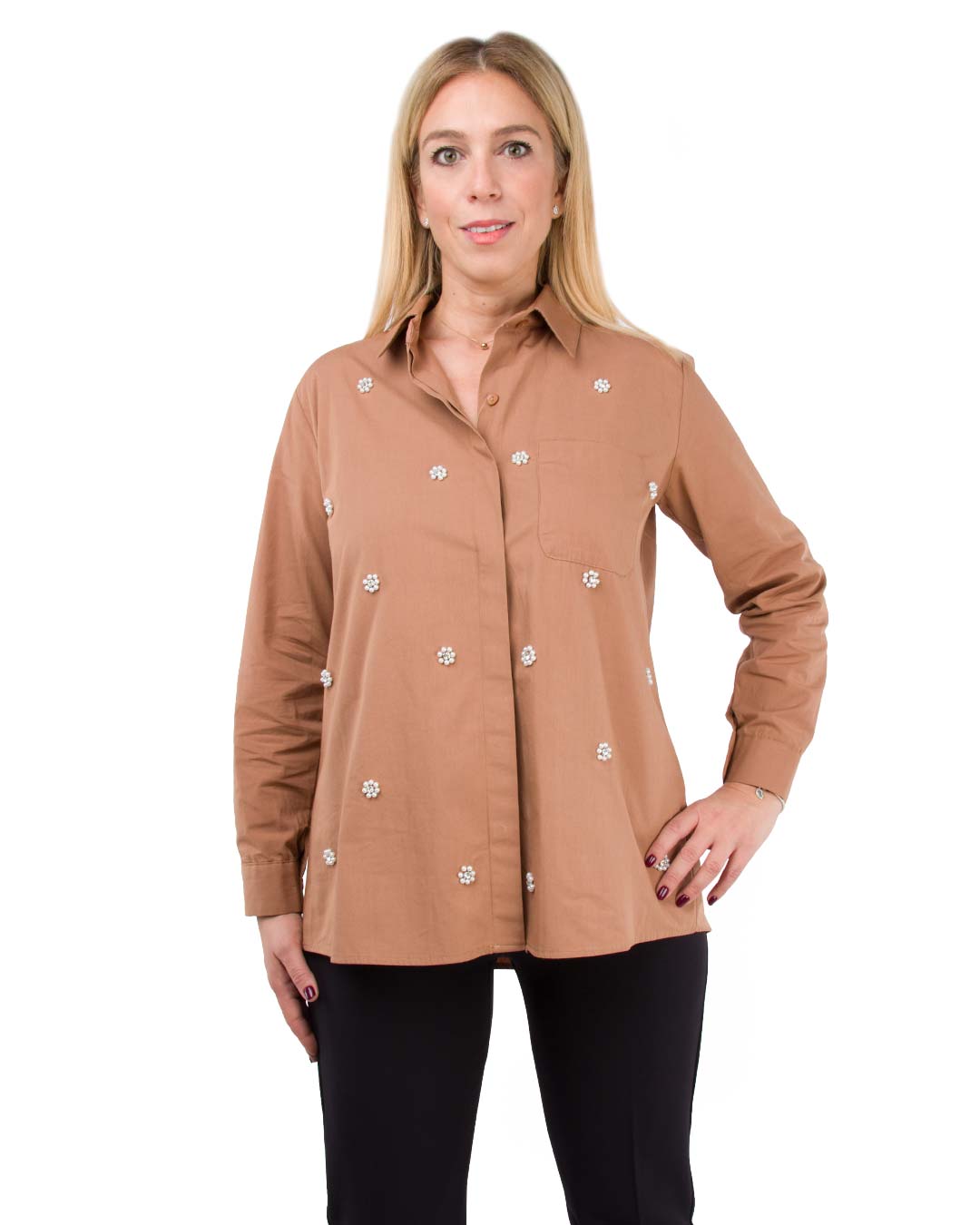 - Αυτό που το κάνει ξεχωριστό είναι τα διακοσμητικά μοτίβα σε όλη την επιφάνειά του. Τα μοτίβα αποτελούνται απο μικρές πέρλες και στραζένιες πέτρες προσθέτοντας μια ιδιαίτερη και κομψή πινελιά στο ρούχο. Το σχέδιο αυτό δίνει μια πιο εκλεπτυσμένη αίσθηση στο κάμελ πουκάμισο ,κάνοντάς το κατάλληλο για ειδικές περιστάσεις ακόμη και για καθημερινή εμφάνιση με στυλ.