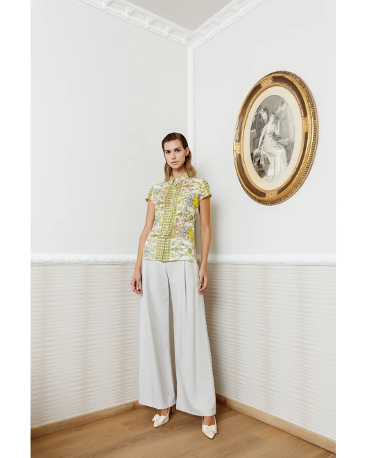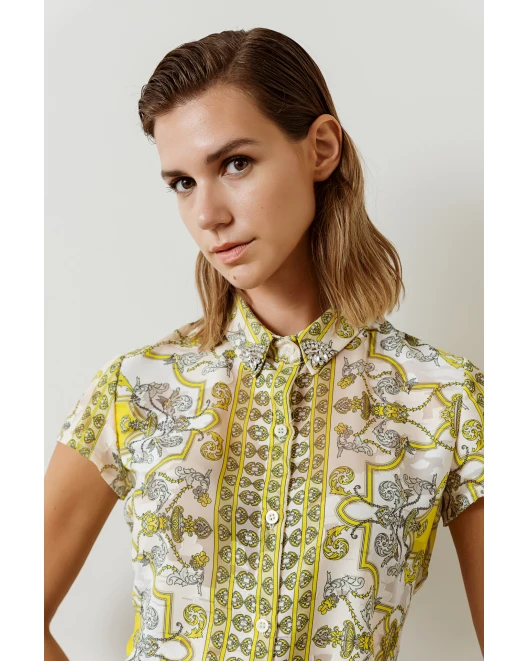 - Πουκάμισο με εμπριμέ μοτίφ σε φωτεινές Lime αποχρώσεις , διακοσμημένο με ασημί πέτρες στο γιακά. Ελληνικής παραγωγής, επώνυμης εταιρίας .