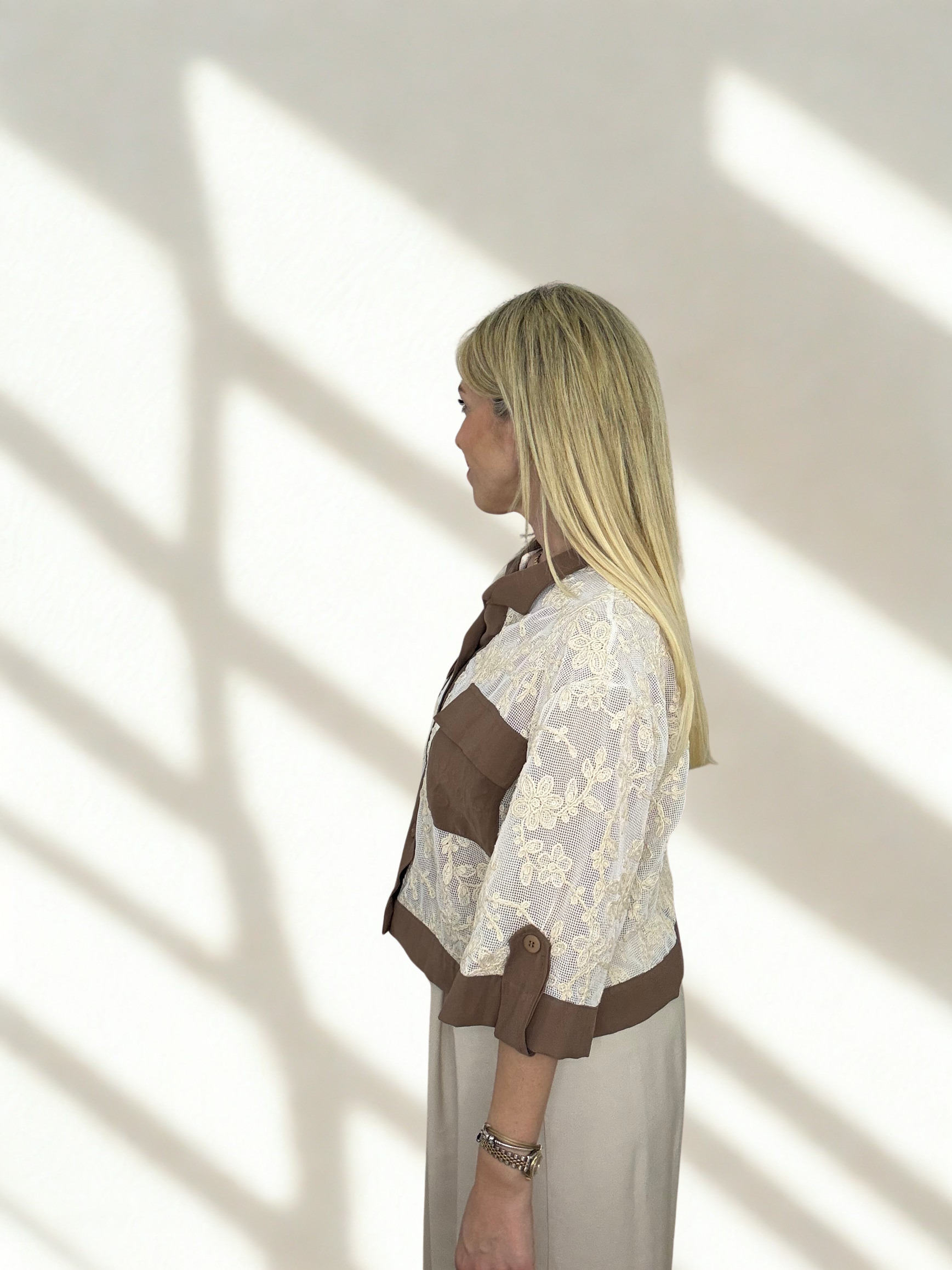 Ένα ιδιαίτερο πουκάμισο που συνδυάζει ρομαντισμό και σύγχρονο στυλ, ιδανικό για ξεχωριστές εμφανίσεις. Η δαντελένια υφή του χαρίζει κομψότητα και θηλυκότητα, ενώ οι contrast λεπτομέρειες σε γήινες αποχρώσεις προσθέτουν μία μοντέρνα και elegant πινελιά.