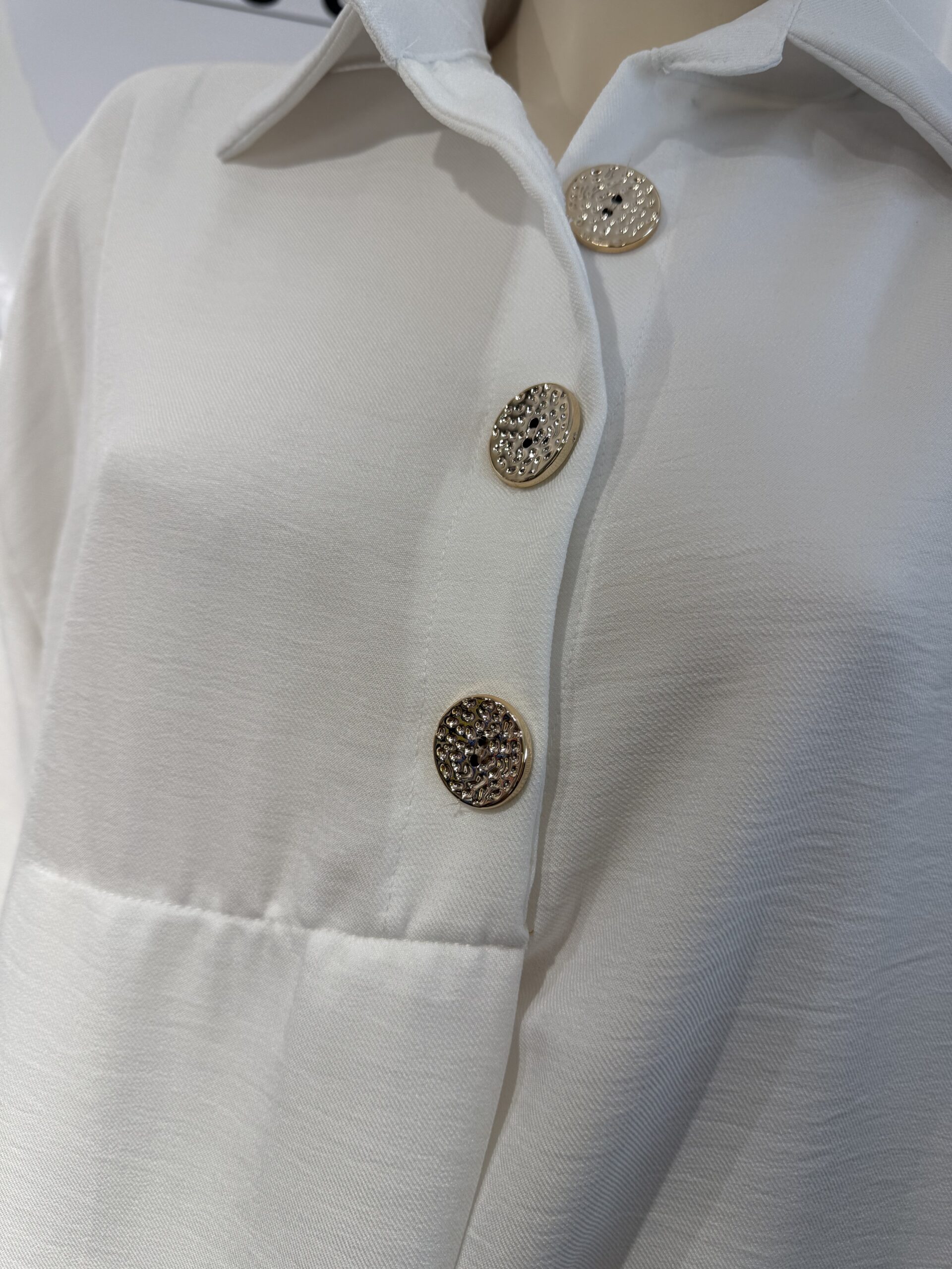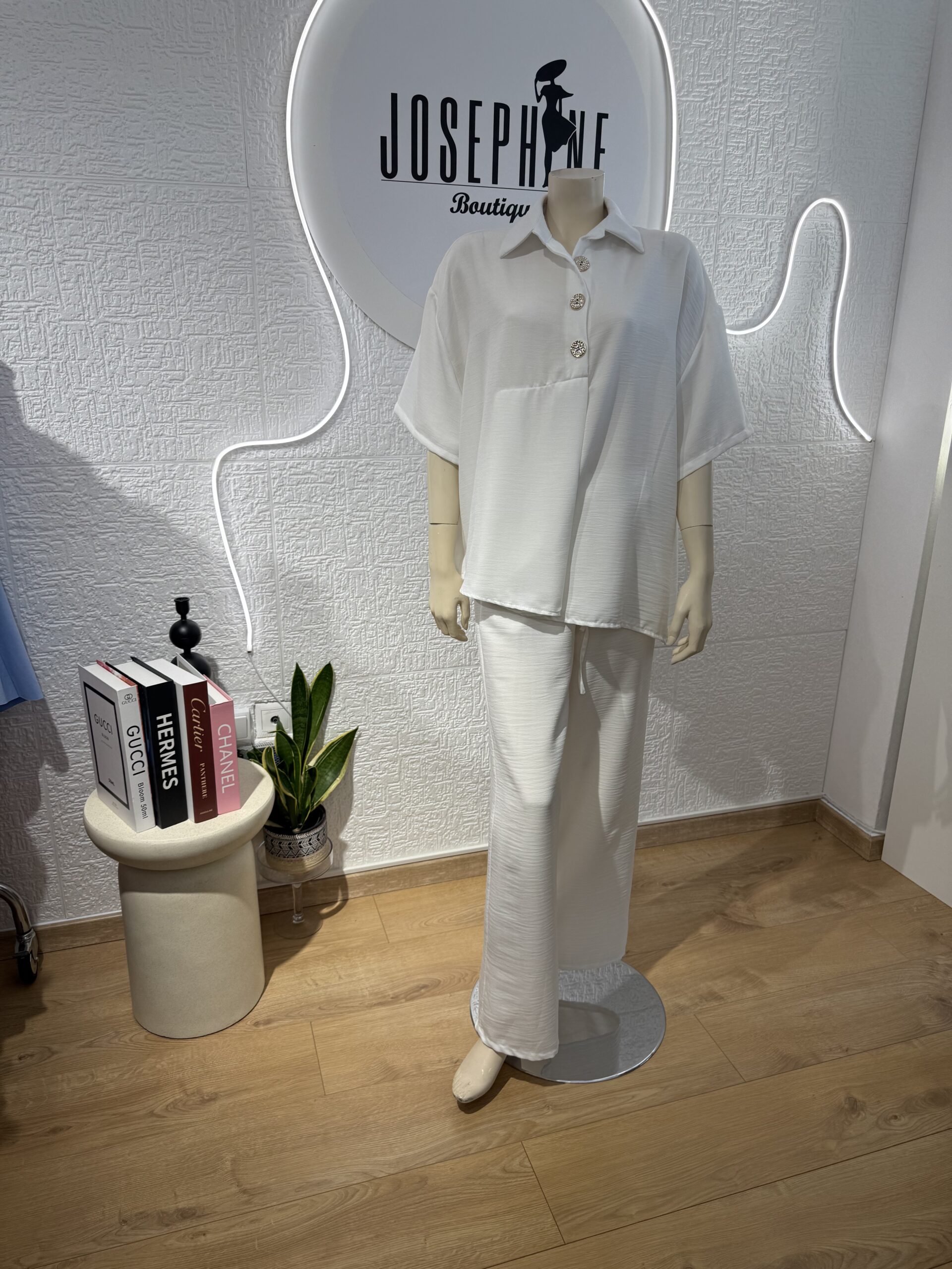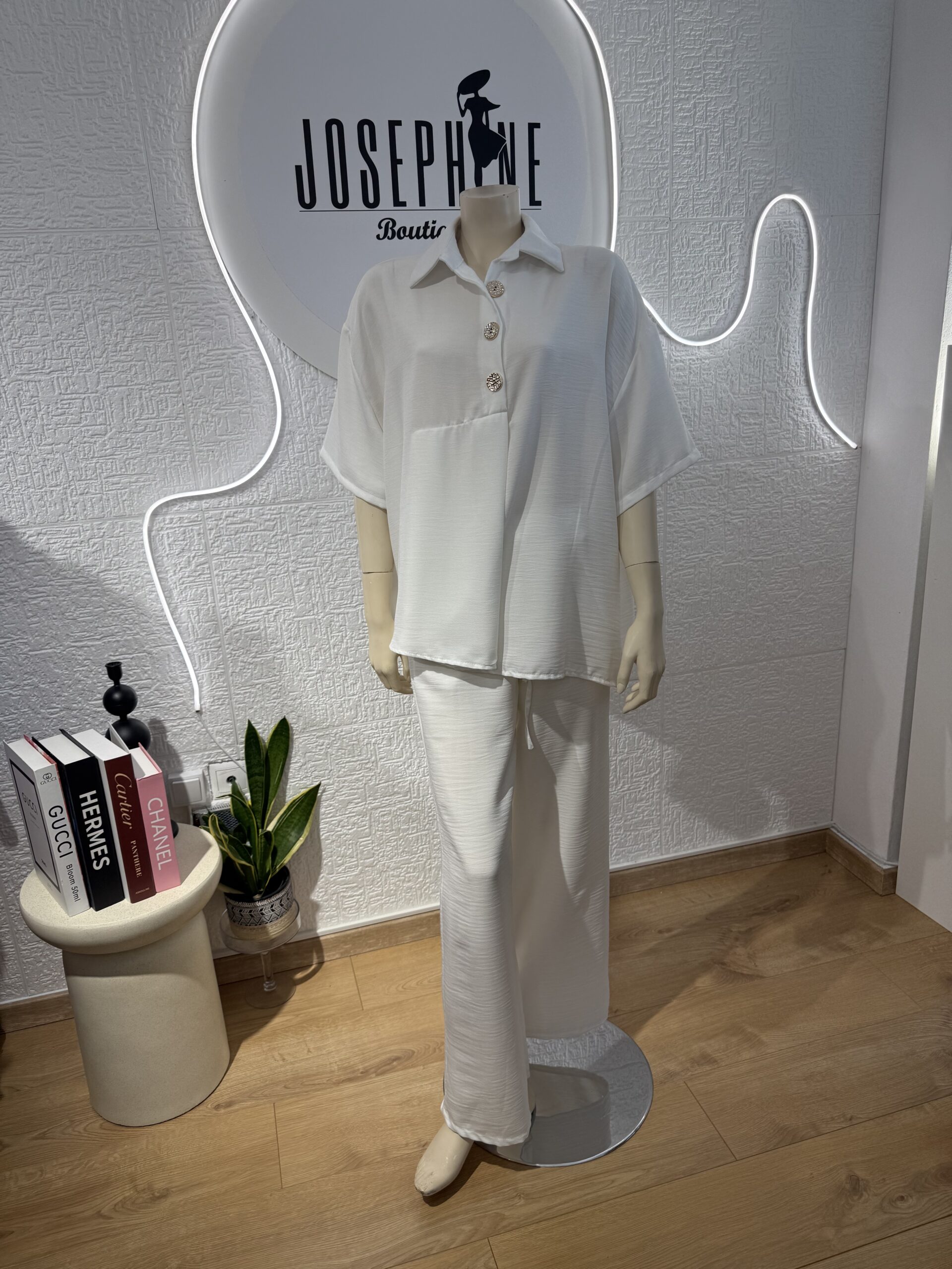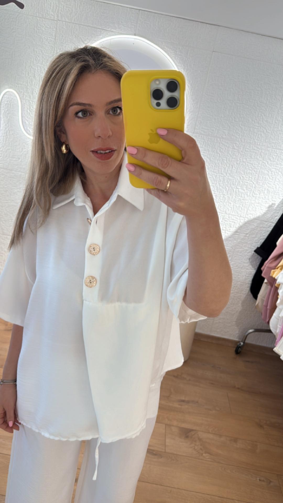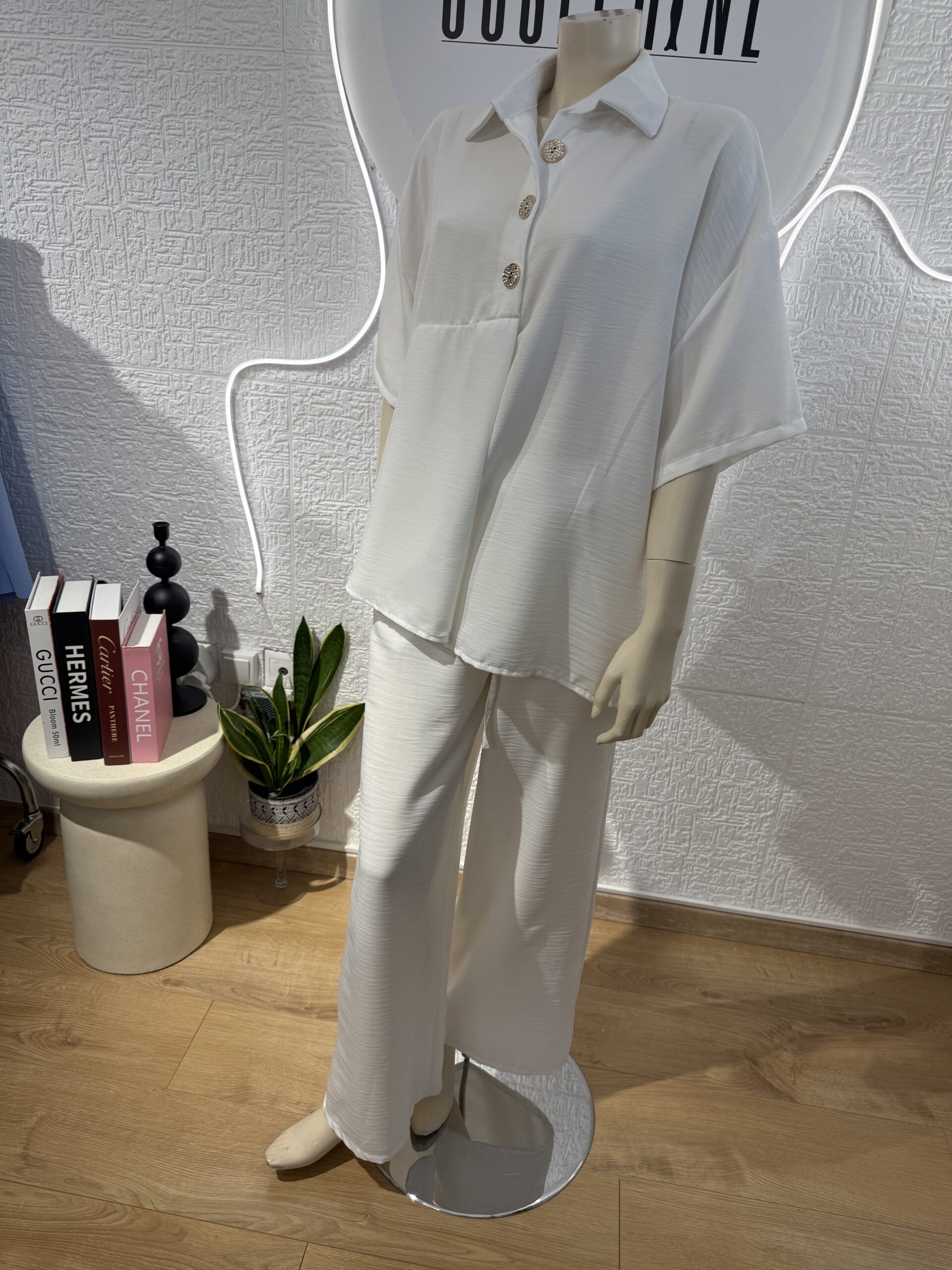 - Σετ σε λευκό χρώμα που αποτελείται απο ριχτή μπλούζα με γιακά και αέρινα μανίκια ,στολισμένη με τρία χρυσά κουμπιά που δίνουν ένα μοντέρνο στυλ στο ρούχο και ένα πολύ άνετο παντελόνι με λάστιχο στην μέση . Είναι κατάλληλο για όλες τις περιστάσεις .