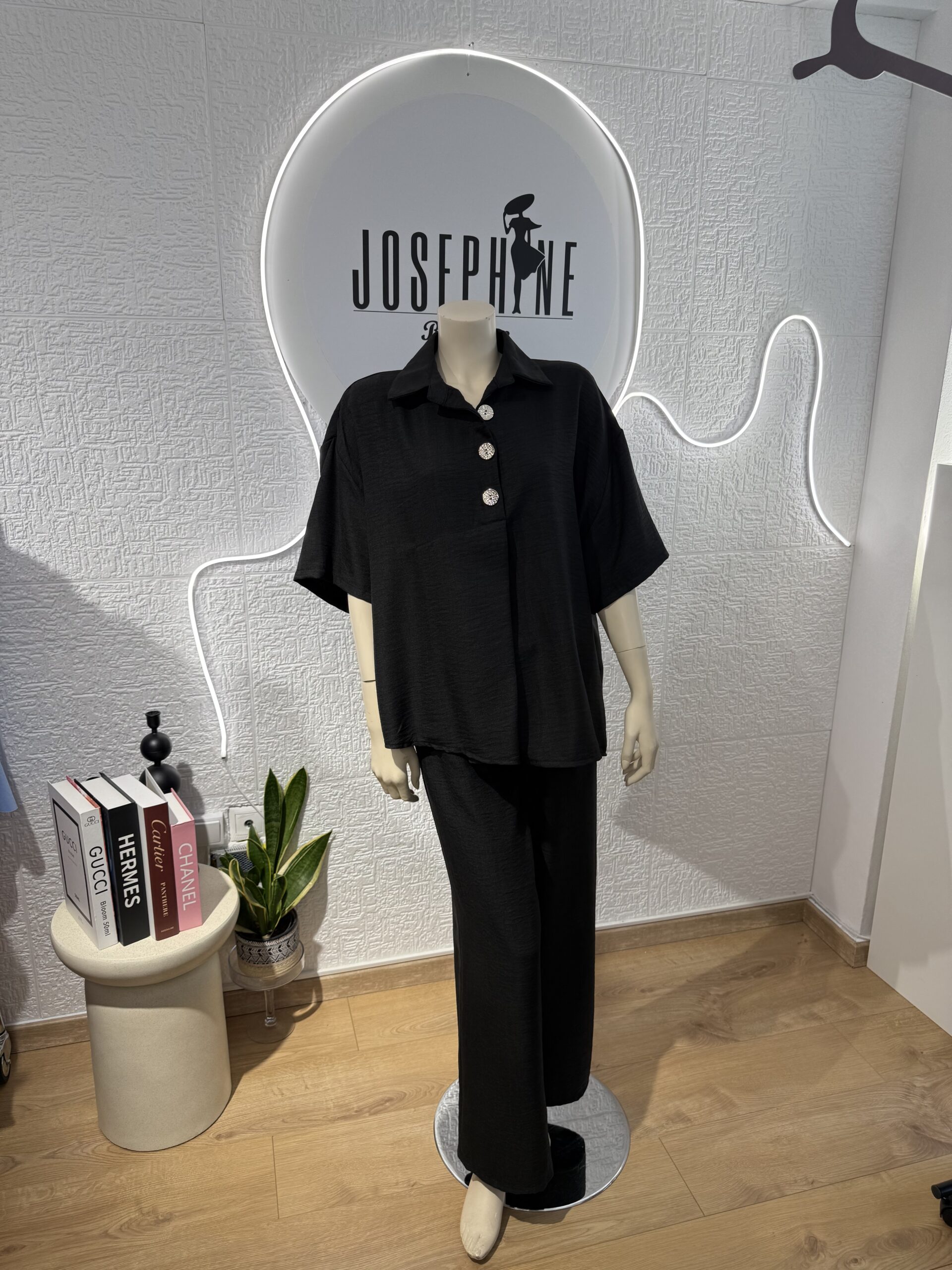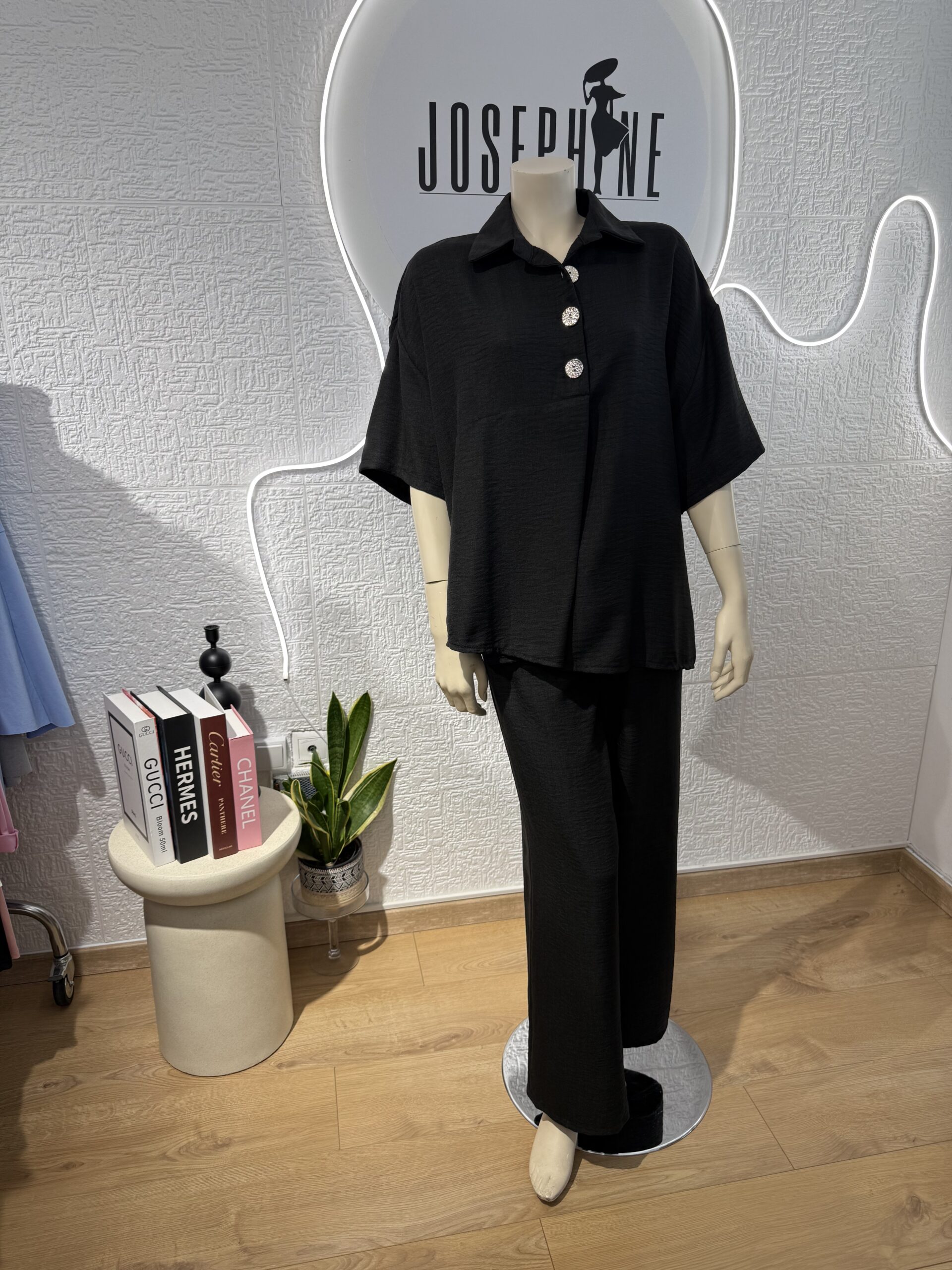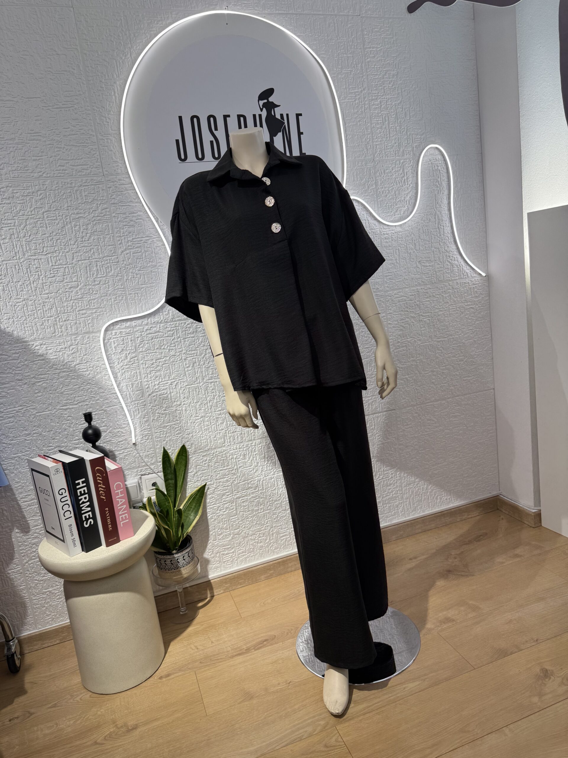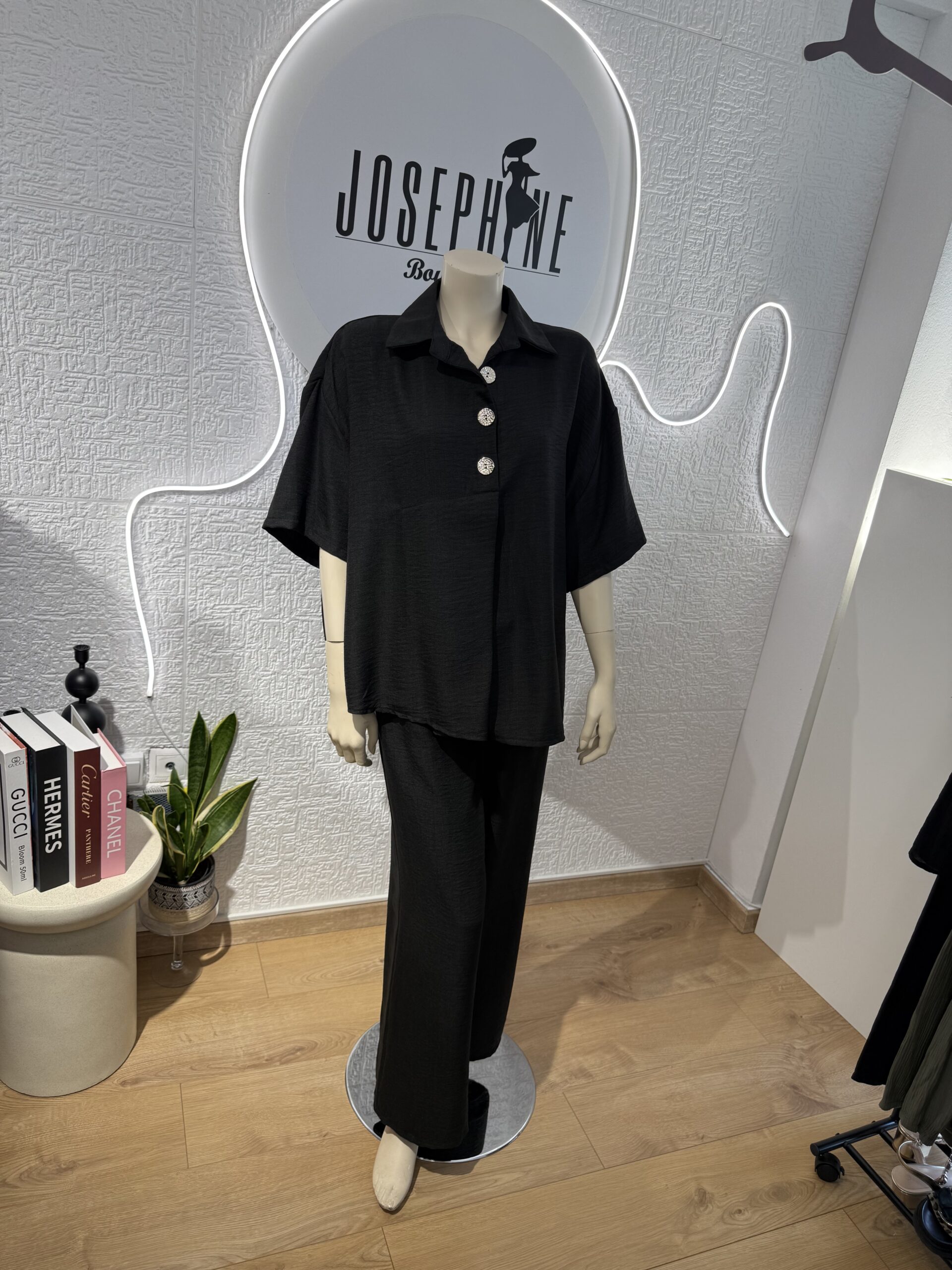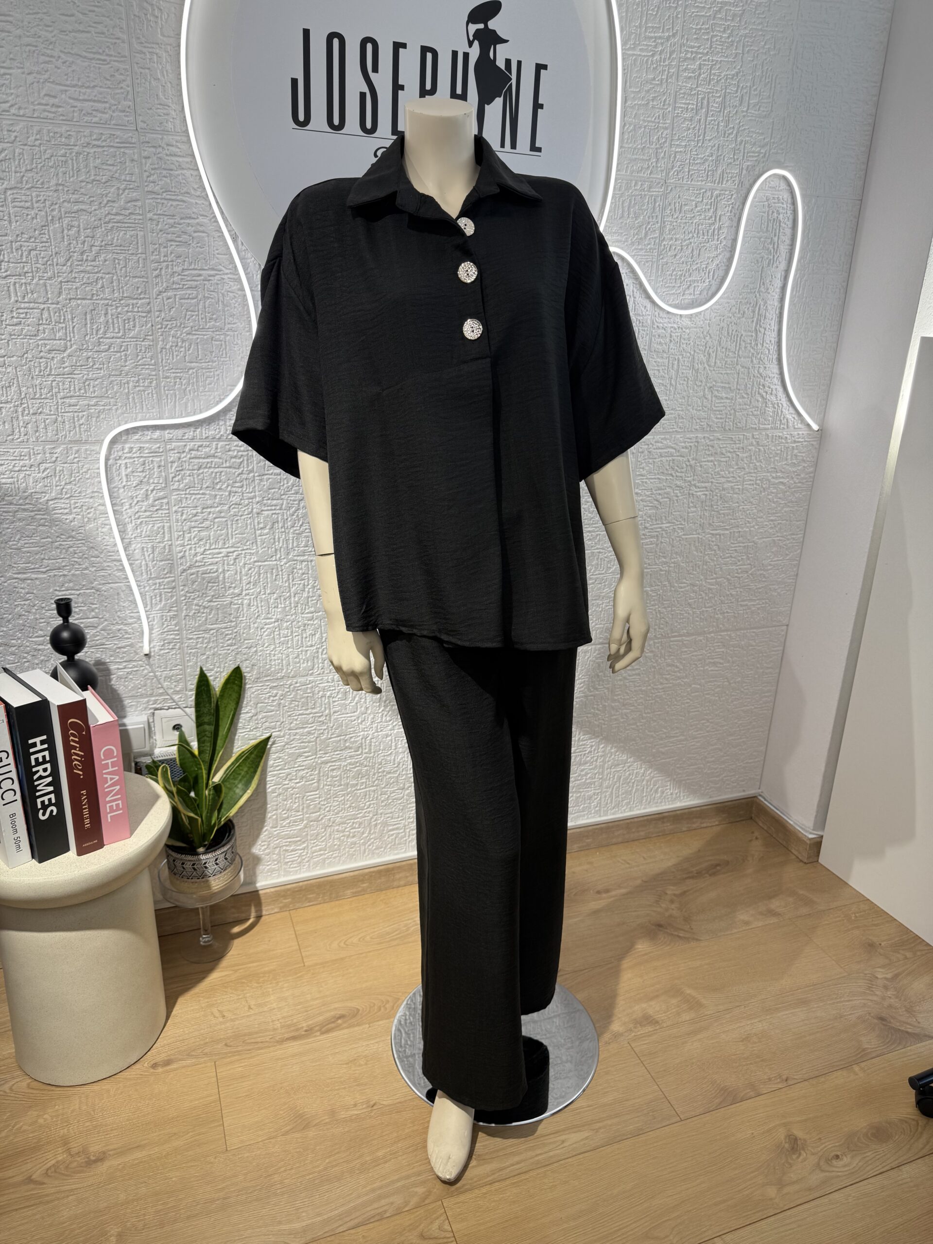 - Σετ σε μαύρο χρώμα που αποτελείται απο ριχτή μπλούζα με γιακά στολισμένη με τρία χρυσά κουμπιά που δίνουν ένα μοντέρνο στυλ στο ρούχο και ένα πολύ άνετο παντελόνι με λάστιχο στην μέση . Είναι κατάλληλο για όλες τις περιστάσεις .