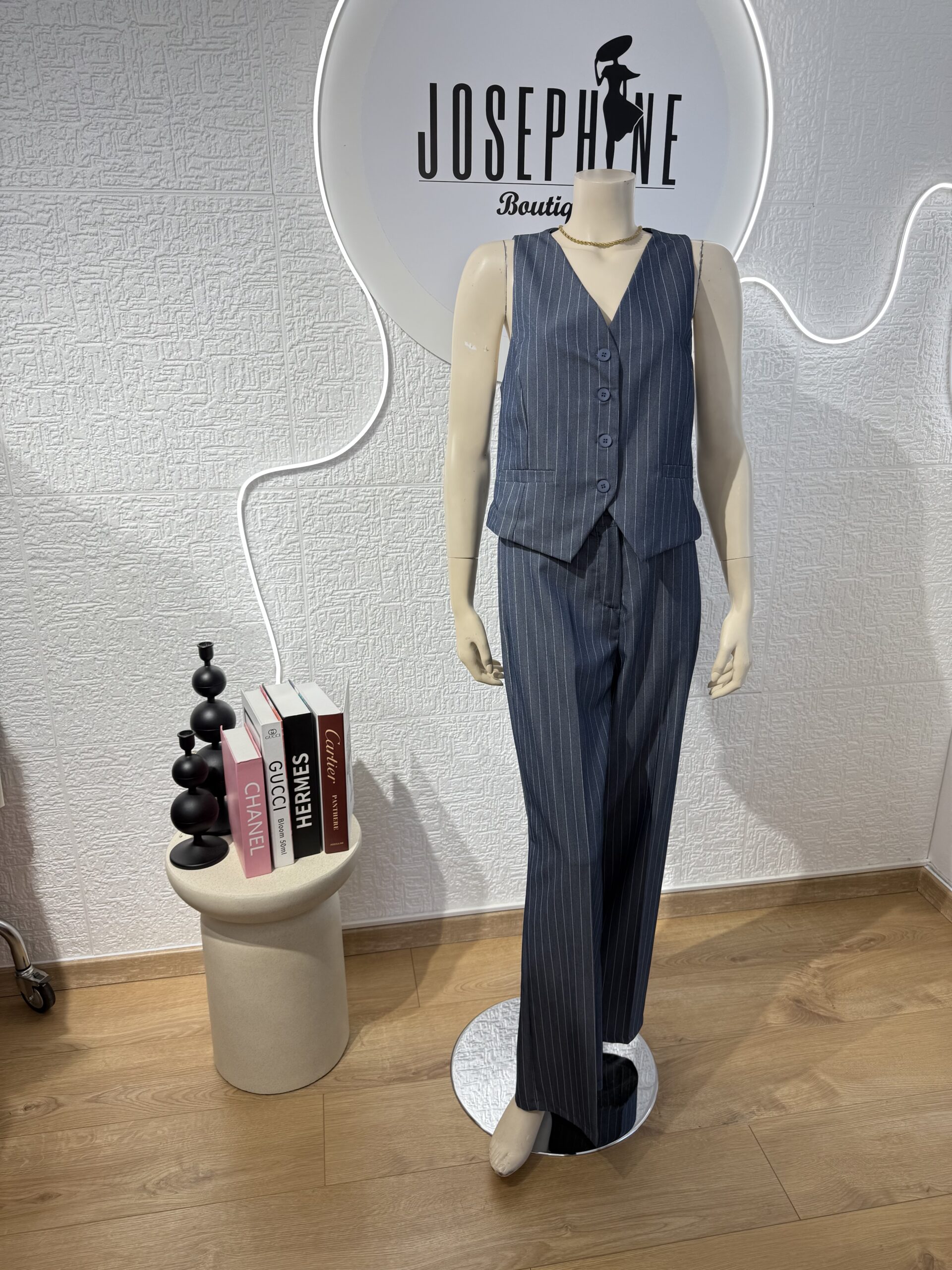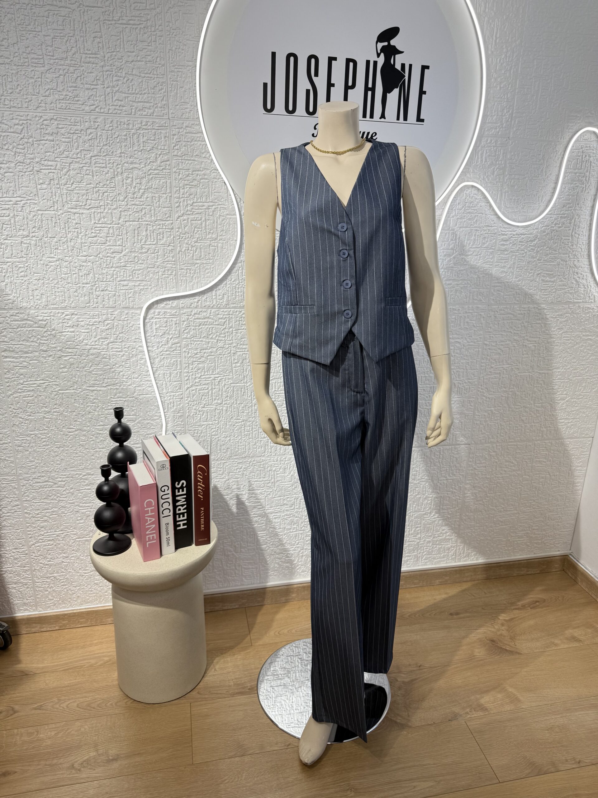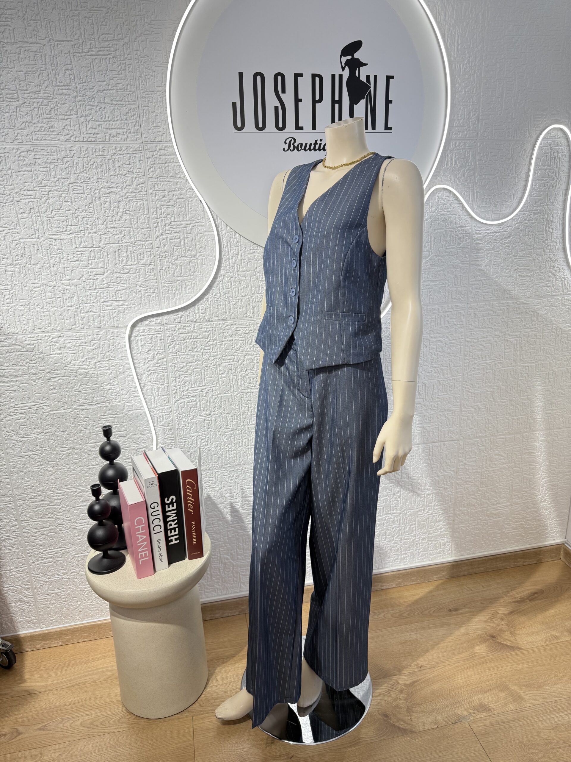- Σετ ριγέ πολύ στιλάτο με γιλέκο που κλείνει με τέσσερα κουμπιά και παντελόνι με ζωνάκι πρόσθετο και κοφτές τσέπες στο πλάι, με λάστιχο στην μέση στο πίσω μέρος πολύ άνετο . Το σετ είναι σε άνετη γραμμή που κολακεύει το σώμα και δίνει ένα κομψό και μοντέρνο στυλ. Μπορεί να φορεθεί σε όλες τις περιστάσεις είτε με πουκάμισο ή μπλουζάκι απο μέσα ,