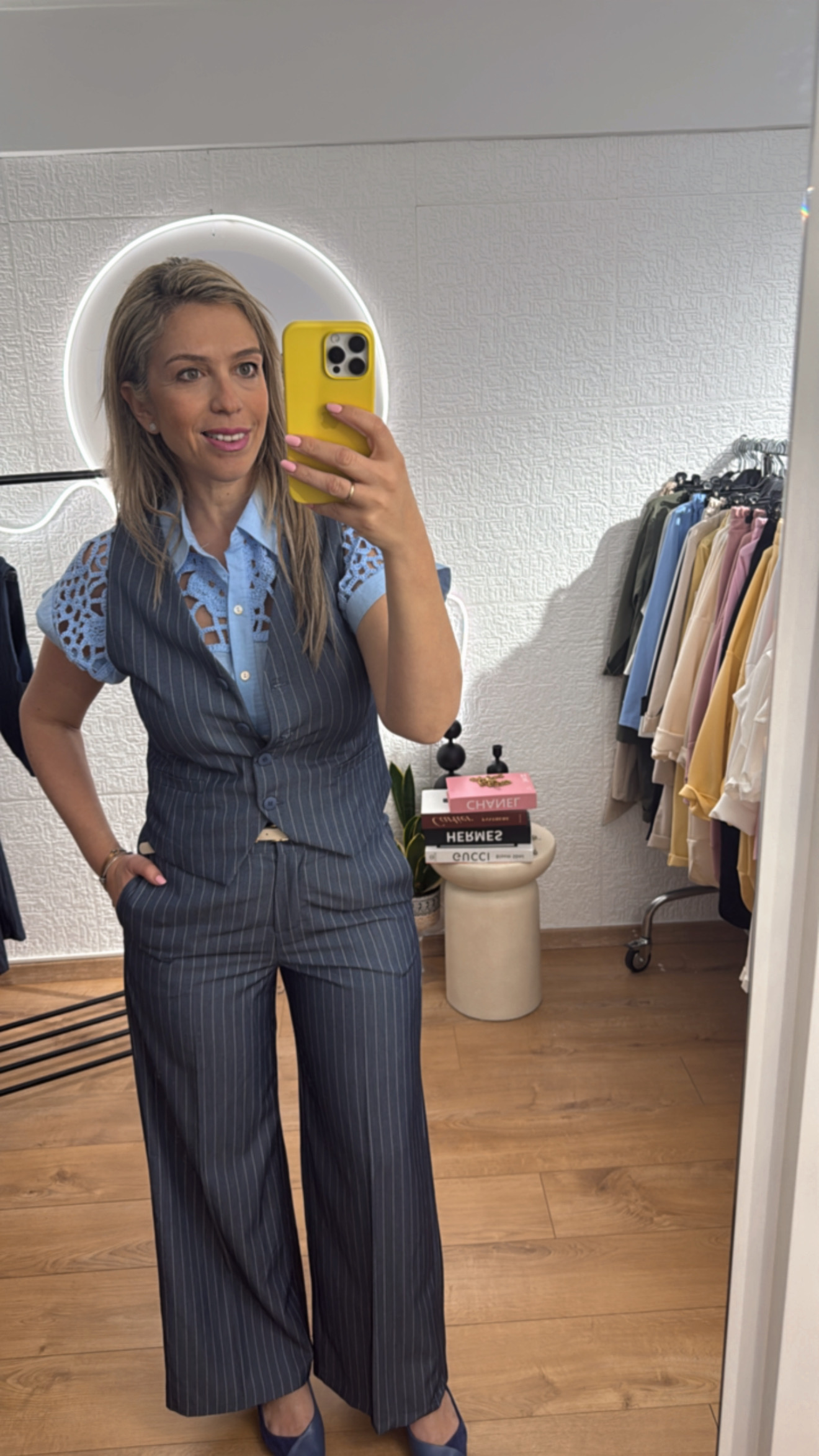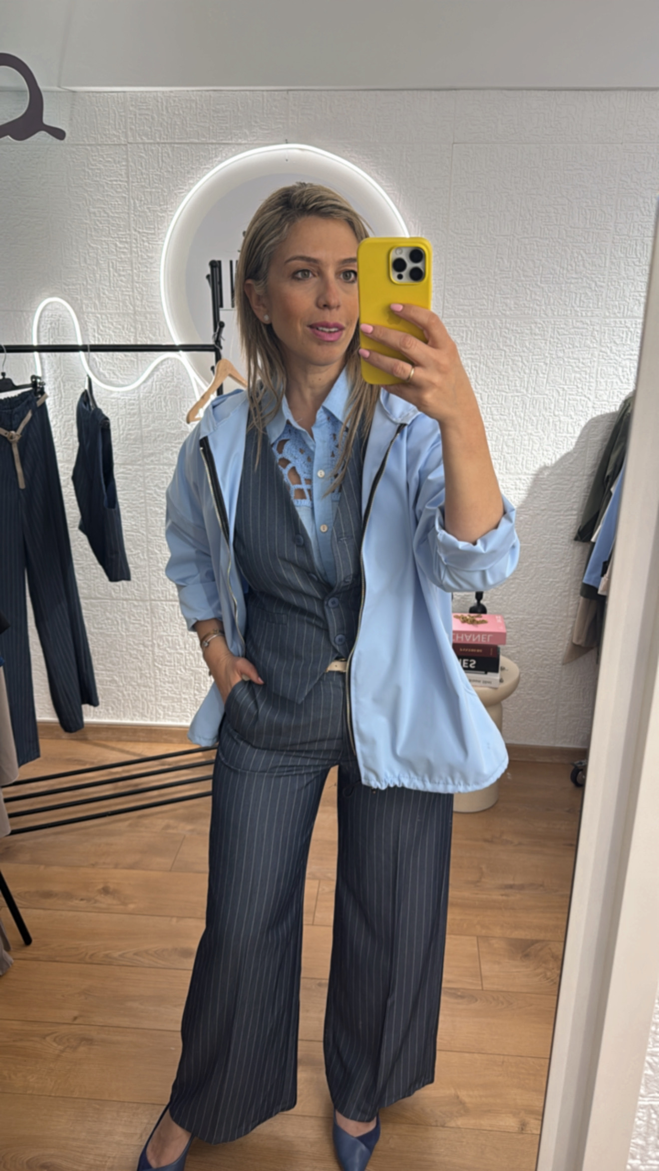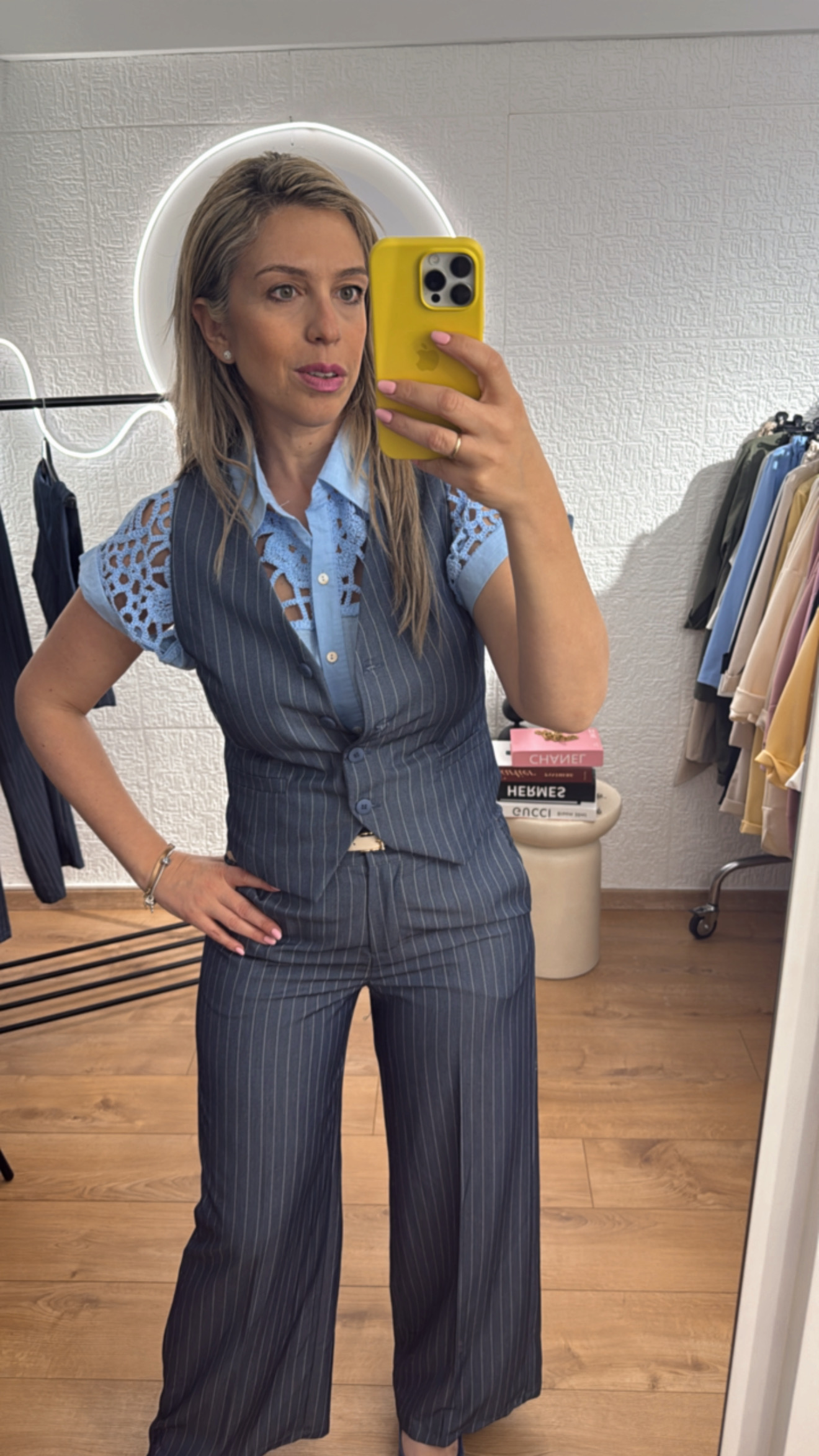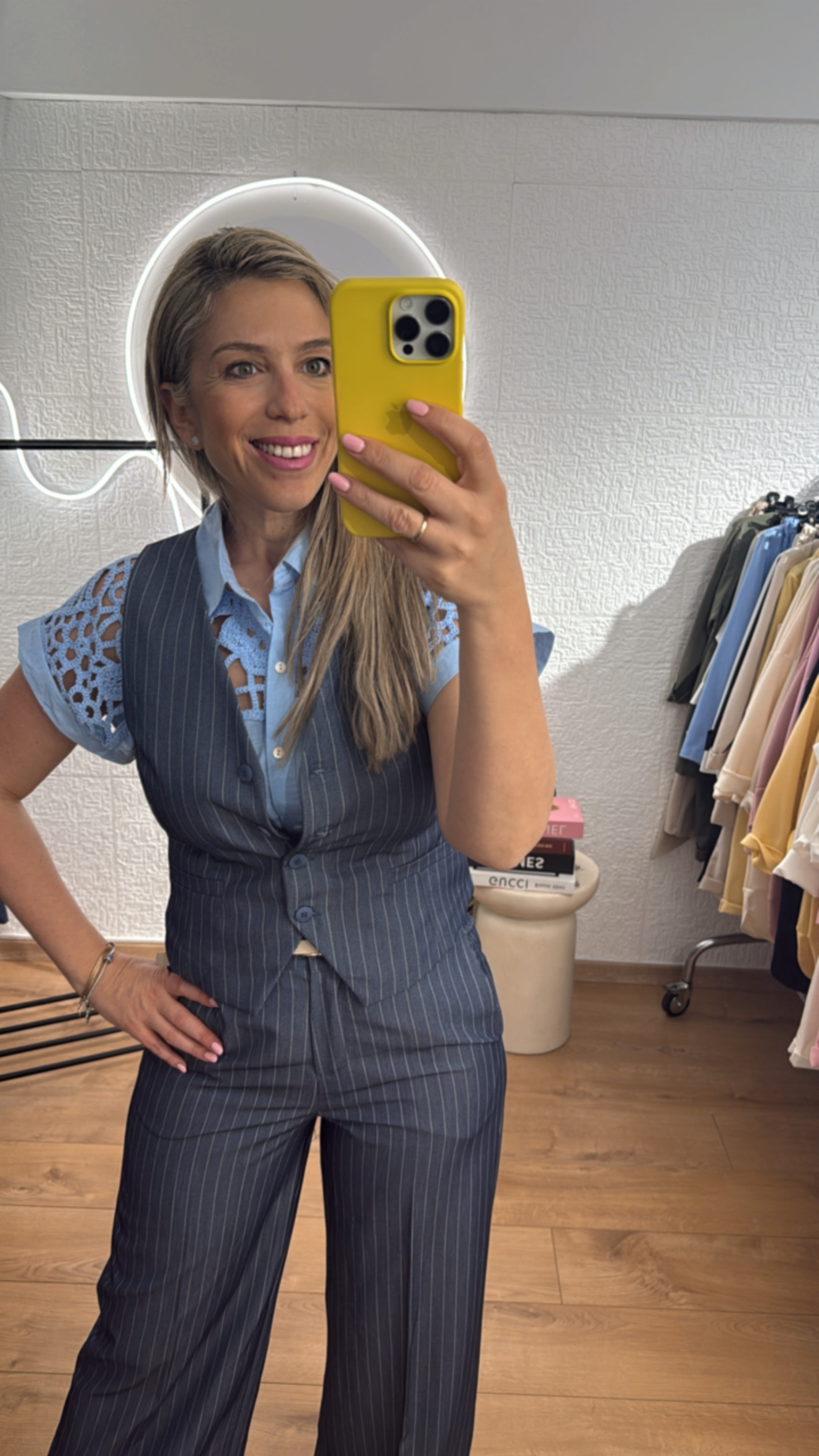 - Σετ ριγέ πολύ στιλάτο με γιλέκο που κλείνει με τέσσερα κουμπιά και παντελόνι με ζωνάκι πρόσθετο και κοφτές τσέπες στο πλάι, με λάστιχο στην μέση στο πίσω μέρος πολύ άνετο . Το σετ είναι σε άνετη γραμμή που κολακεύει το σώμα και δίνει ένα κομψό και μοντέρνο στυλ. Μπορεί να φορεθεί σε όλες τις περιστάσεις είτε με πουκάμισο ή μπλουζάκι απο μέσα ,