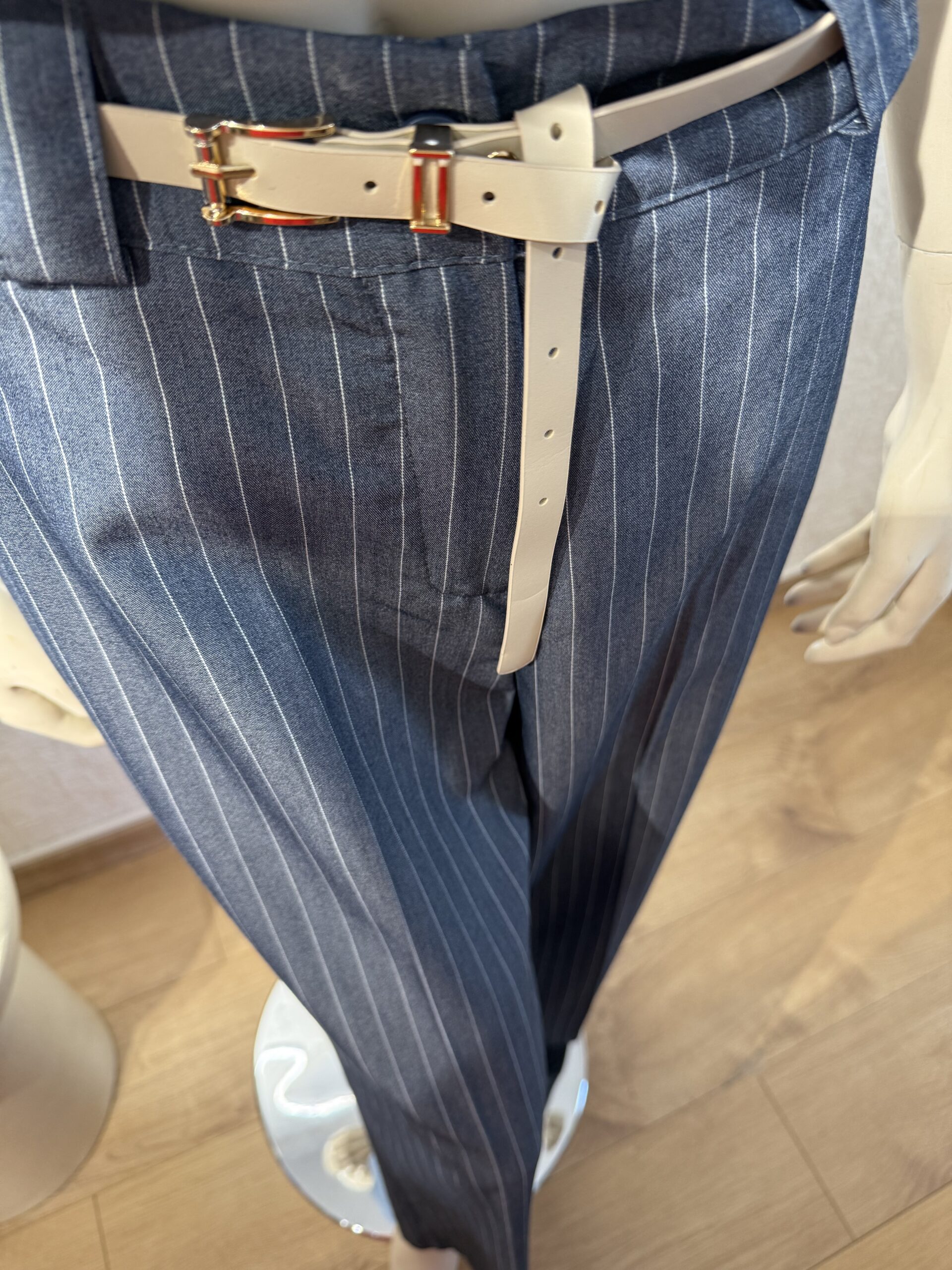 - Σε ριγέ μπλέ τζην χρώμα .