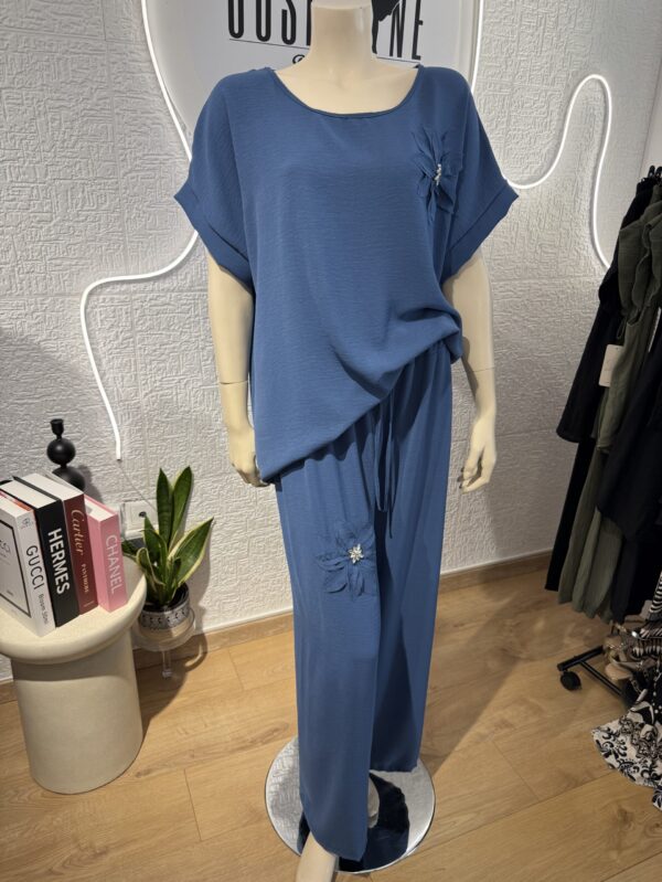 - Σετ Σακάκι με λοξό κούμπωμα και κοντά αέρινα μανίκια που κλείνει με ένα μεγάλο χρυσό κουμπί και πρόσθετο λεπτό ζωνάκι και παντελόνι με λάστιχο στην μέση πολύ άνετο . Το σετ είναι σε άνετη γραμμή που κολακεύει το σώμα και δίνει ένα κομψό και μοντέρνο στυλ. Μπορεί να φορεθεί σε όλες τις περιστάσεις είτε με πουκάμισο ή μπλουζάκι απο μέσα ,