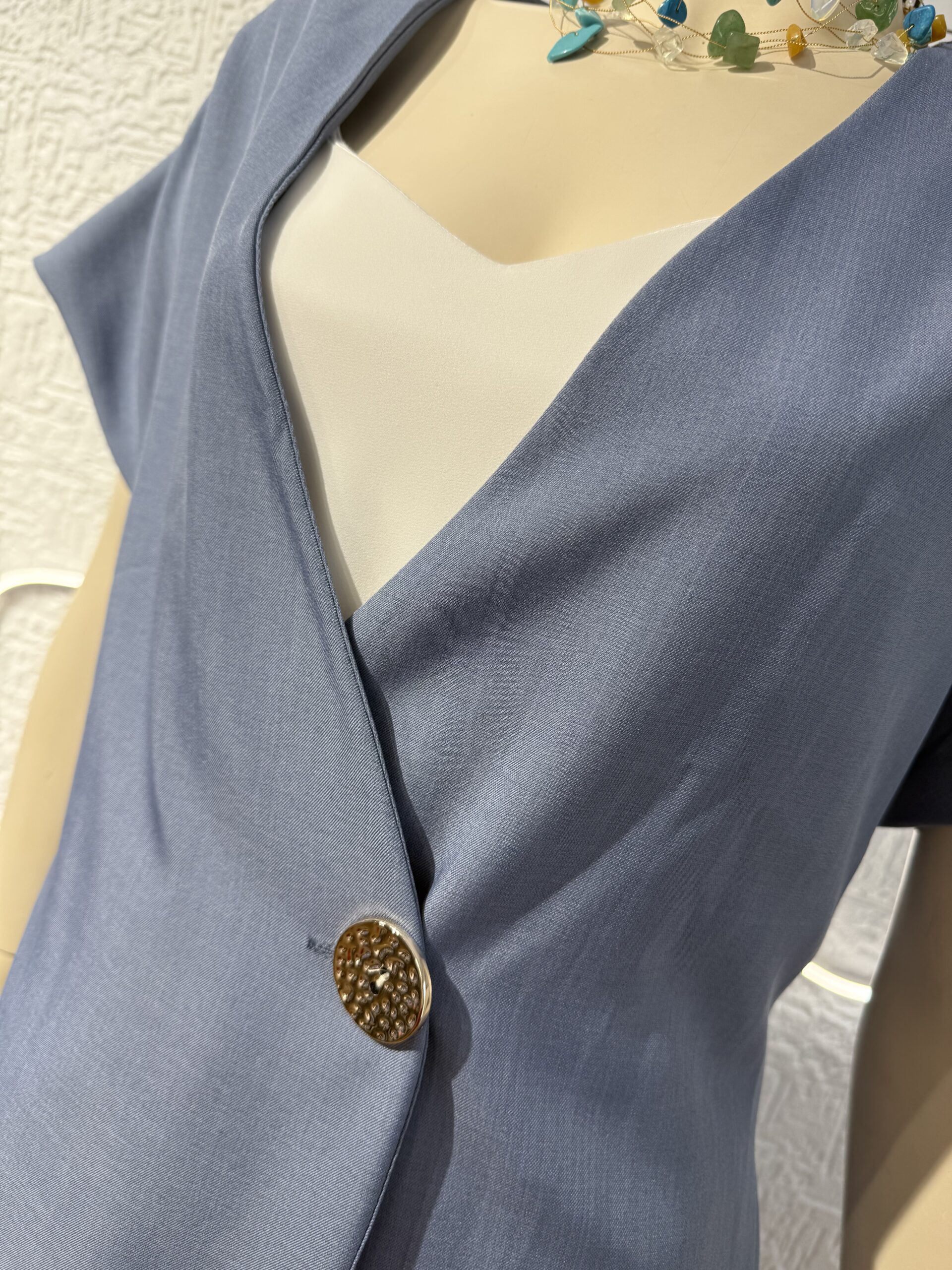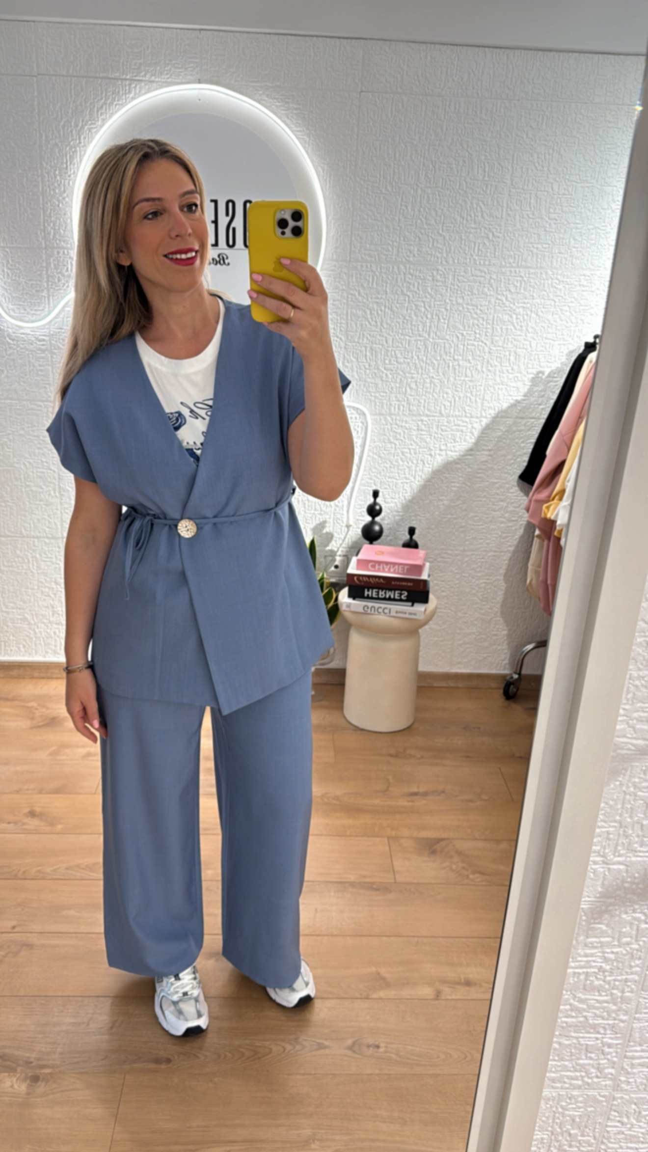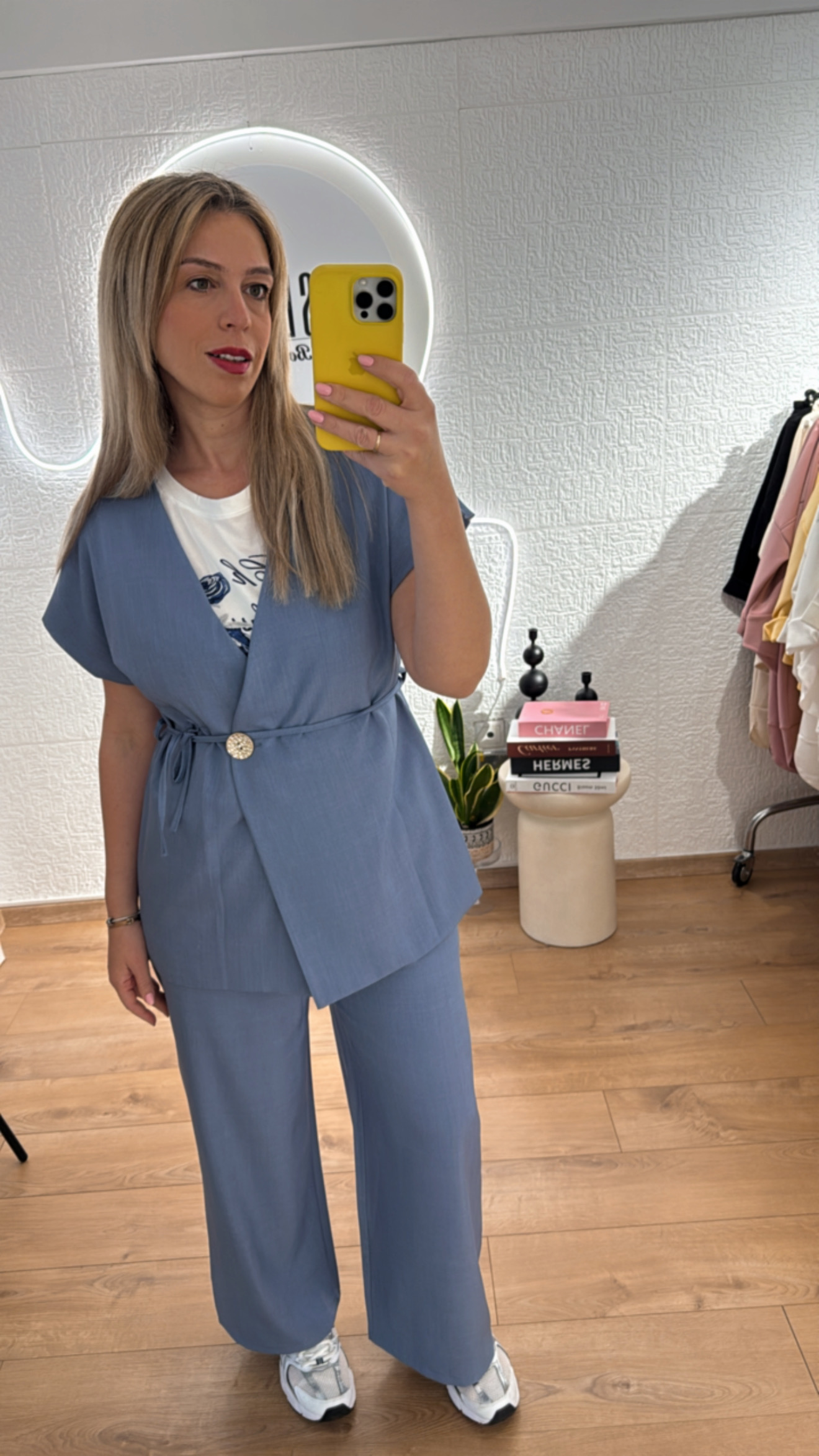 - Σετ Σακάκι με λοξό κούμπωμα και κοντά αέρινα μανίκια που κλείνει με ένα μεγάλο χρυσό κουμπί και πρόσθετο λεπτό ζωνάκι και παντελόνι με λάστιχο στην μέση πολύ άνετο . Το σετ είναι σε άνετη γραμμή που κολακεύει το σώμα και δίνει ένα κομψό και μοντέρνο στυλ. Μπορεί να φορεθεί σε όλες τις περιστάσεις είτε με πουκάμισο ή μπλουζάκι απο μέσα ,