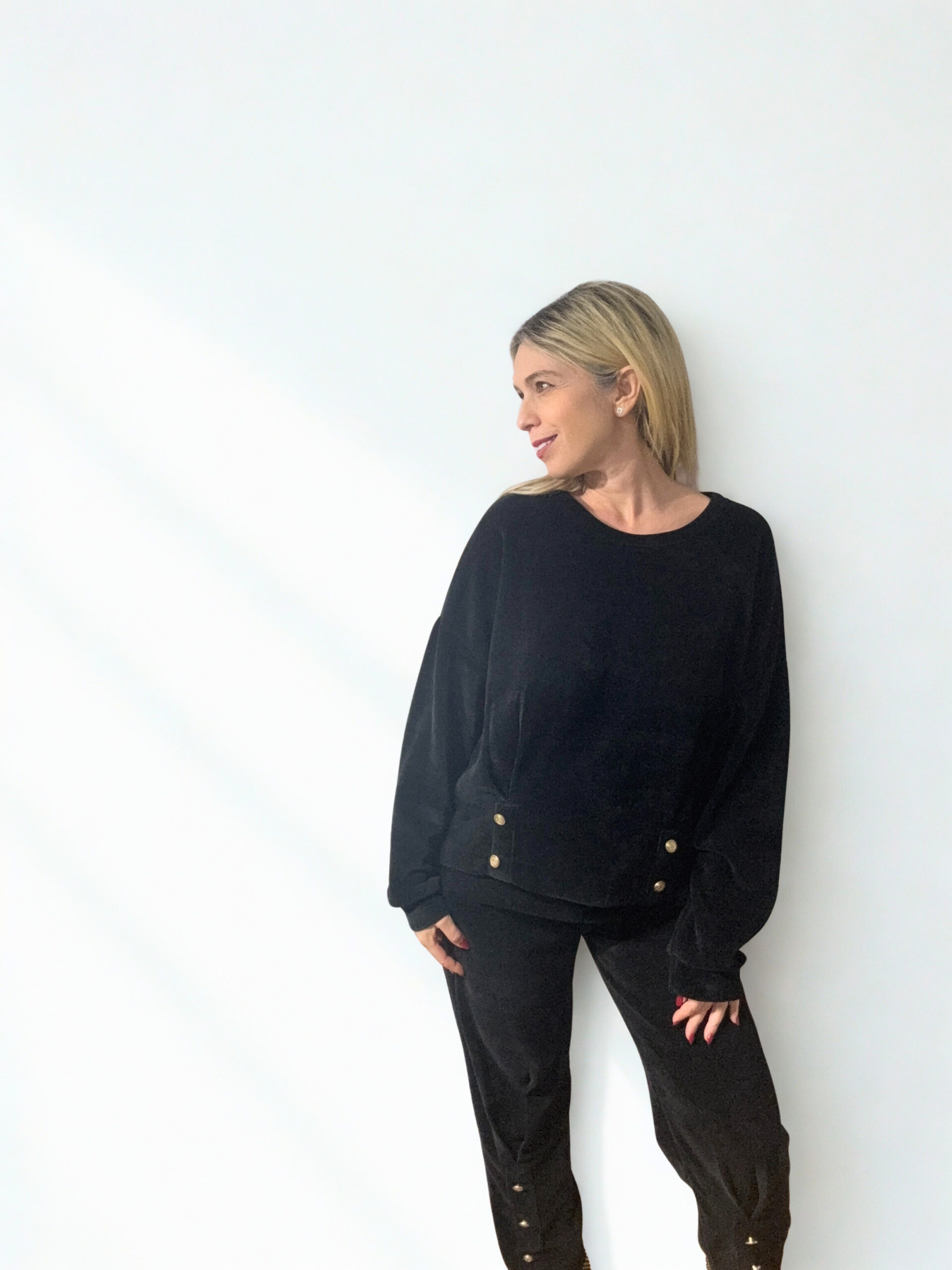 Ένα ιδιαίτερο καθημερινό σετ για εντυπωσιακές casual εμφανίσεις. Αποτελείται από μπλούζα σε oversized γραμμή και παντελόνι με λάστιχο στη μέση και όμορφη εφαρμογή. Η βελουδένια του υφή και οι όμορφες χρυσές λεπτομέρειες του δίνουν ένα όμορφο στυλ. Το παντελόνι δίνεται μαζί με μία εντυπωσιακή ζώνη σε καφέ χρώμα στολισμένη με όμορφες λαμπερές πέτρες.