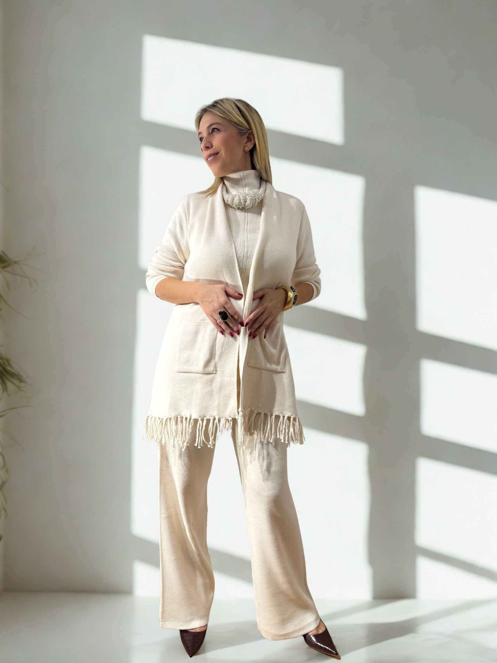 Ένα στυλάτο σετ που θα φορέσεις στην καθημερινότητα σου. Άνετο και συνάμα κομψό. Αποτελείται απο παντελόνι με άνετο λάστιχο στη μέση μαλακό ύφασμα τύπου πλεκτό , μπλούζα αμάνικη με ψηλό λαιμό και μία όμορφη ζακέτα τύπου πλεκτή χωρίς κουμπιά με ιδιαίτερο τελείωμα με κρόσσια. Συνδύασέ το με τα κατάλληλα αξεσουάρ για ένα ολοκληρωμένο αποτέλεσμα.