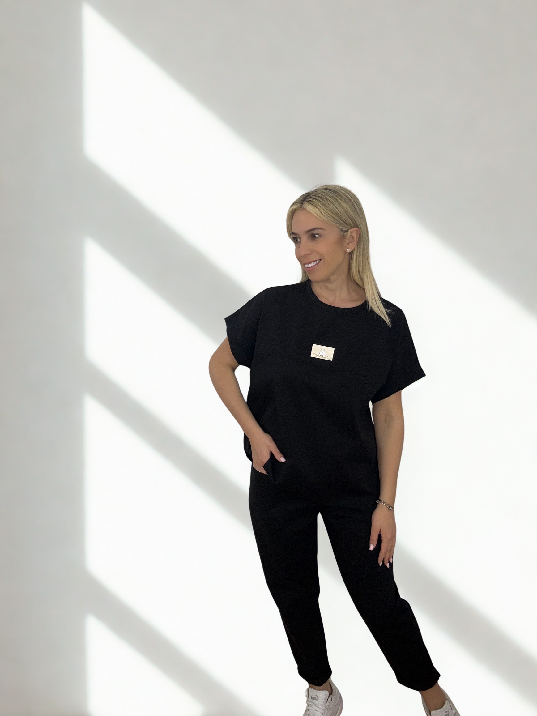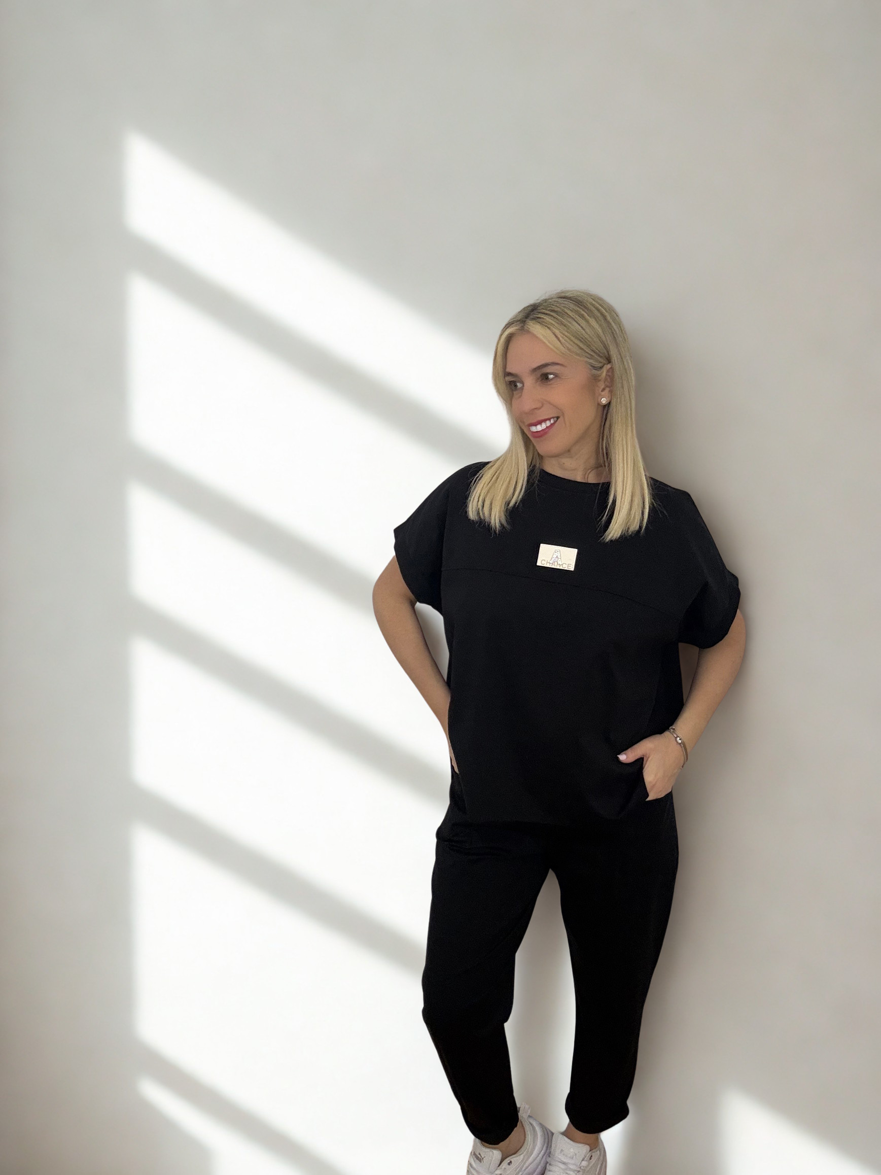 Η μπλούζα σε oversized γραμμή διαθέτει ασύμμετρο τελείωμα, πιο μακριά στο πίσω μέρος, προσφέροντας μοντέρνα αισθητική και άνετη εφαρμογή που κολακεύει όλους τους σωματότυπους. Το παντελόνι με λάστιχο στη μέση και ζώνη εξασφαλίζει τέλεια εφαρμογή και πρακτικότητα, ιδανικό για όλη την ημέρα.