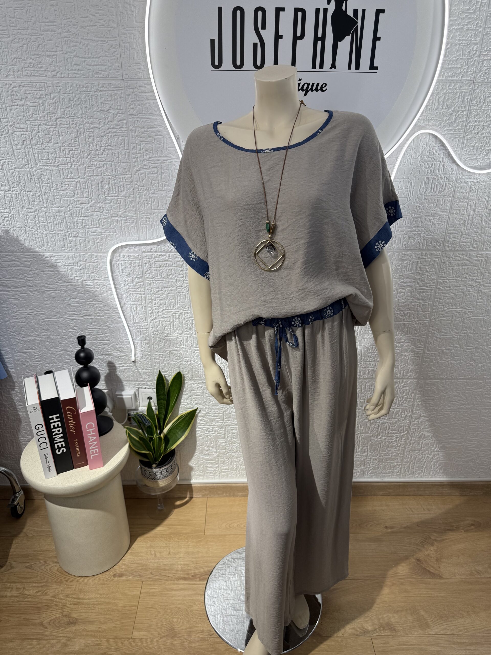 Αέρινο δροσερό σετ σε άνετη γραμμή με όμορφη λεπτομέρεια στο λάστιχο της μέσης και στα μανίκια. Κατάλληλο για τις καθημερινές εμφανίσεις σου. Έχει κοντό χαλαρό μανίκι και άνετο λάστιχο της μέσης. Μπορεί να φορεθεί με την μπλούζα απέξω για πιο χαλαρό στυλ καθώς και με τη μπλούζα από μέσα για να αναδειχτεί η όμορφη λεπτομέρεια στο λάστιχο της μέσης.