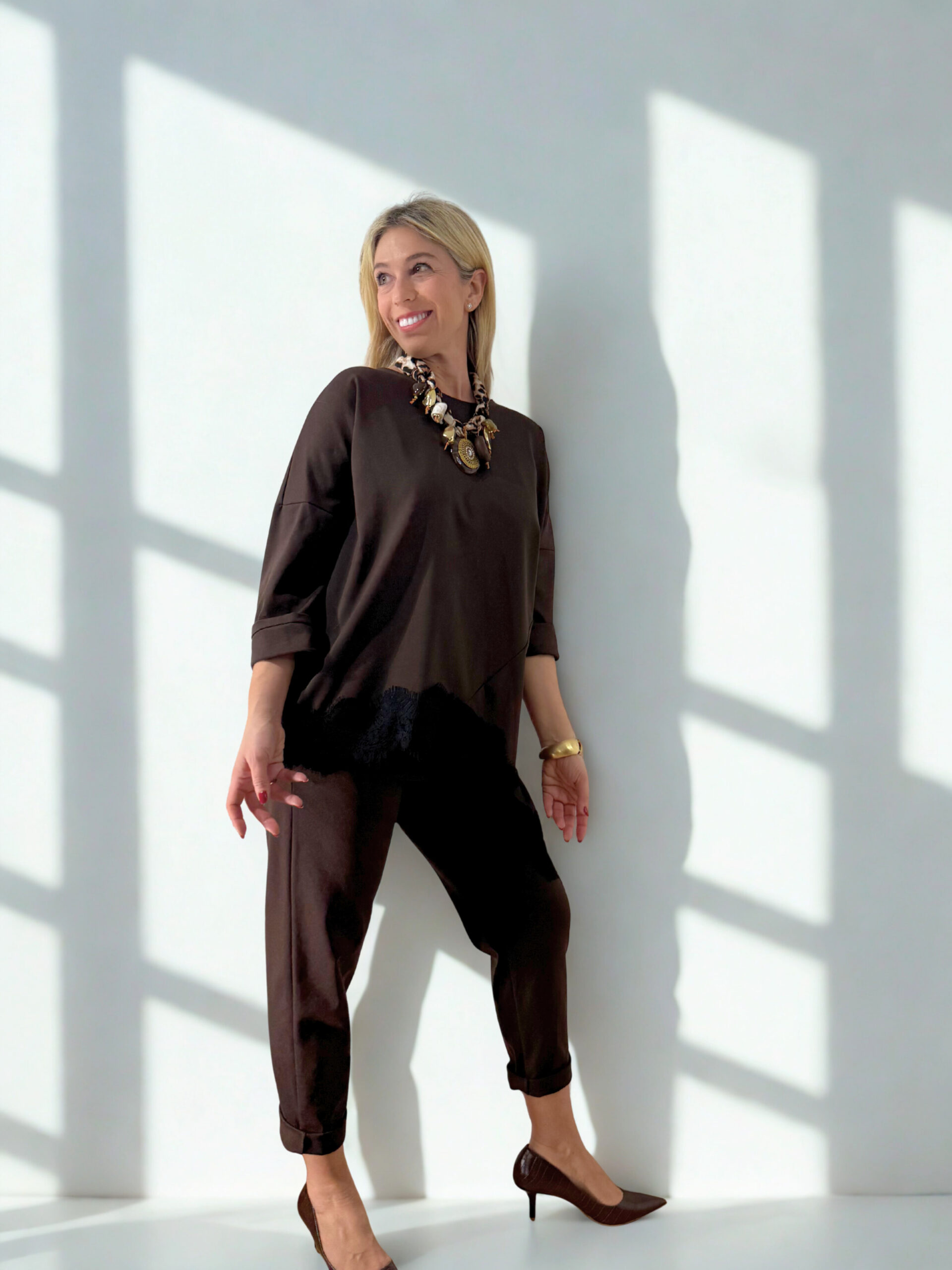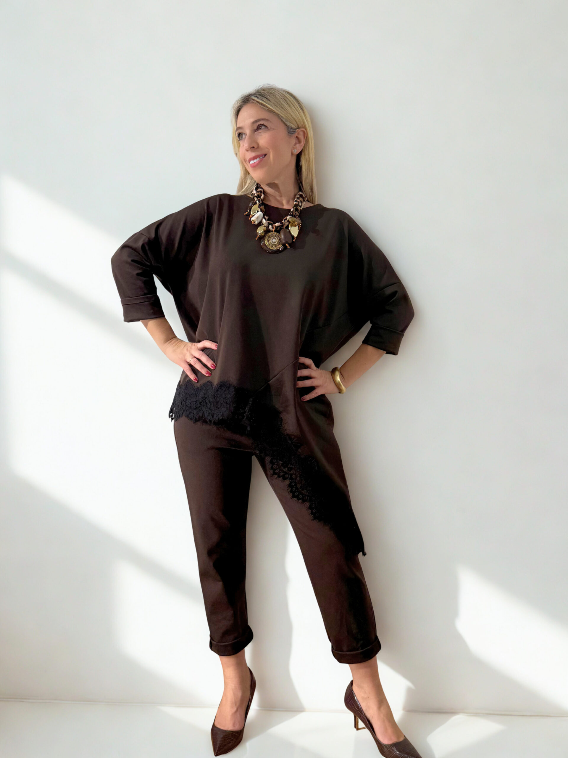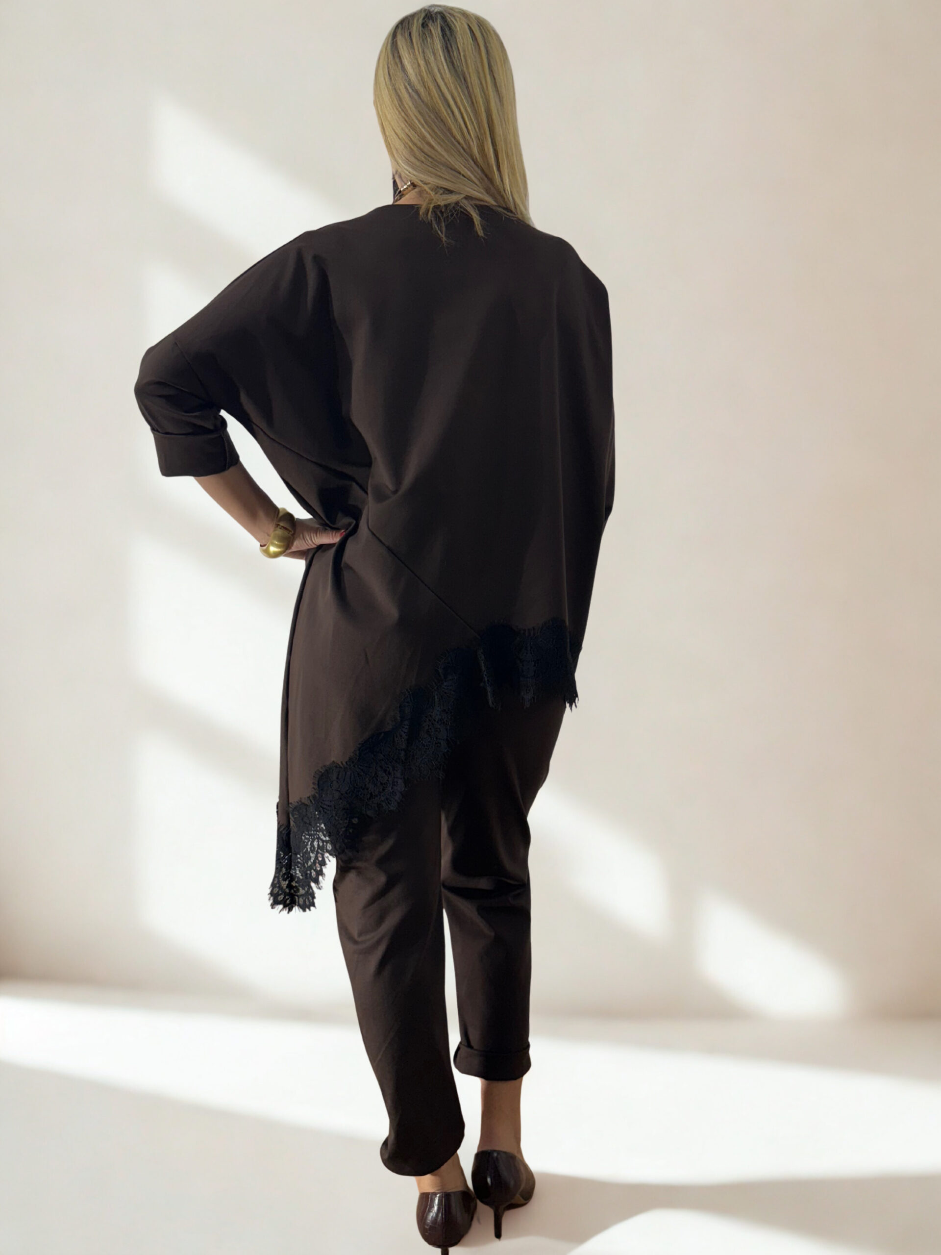 - Ένα πανέμορφο σετ ποντοστόφας που θα σε κάνει να ξεχωρίσεις. Αποτελείται από παντελόνι με άνετο λάστιχο στη μέση και πλαϊνές τσέπες σε ίσια γραμμή και μία μακρυμάνικη μπλούζα με στρόγγυλη λαιμόκοψη και ιδιαίτερο τελείωμα δαντέλας με ασυμμετρία. Η μπλούζα είναι μακριά – μακρύτερη στο ένα μέρος σε ένα πολύ ιδιαίτερο και κομψό σχέδιο. Η δαντέλα στο τελείωμα της μπλούζας, κάνει το σετ να ξεχωρίζει.