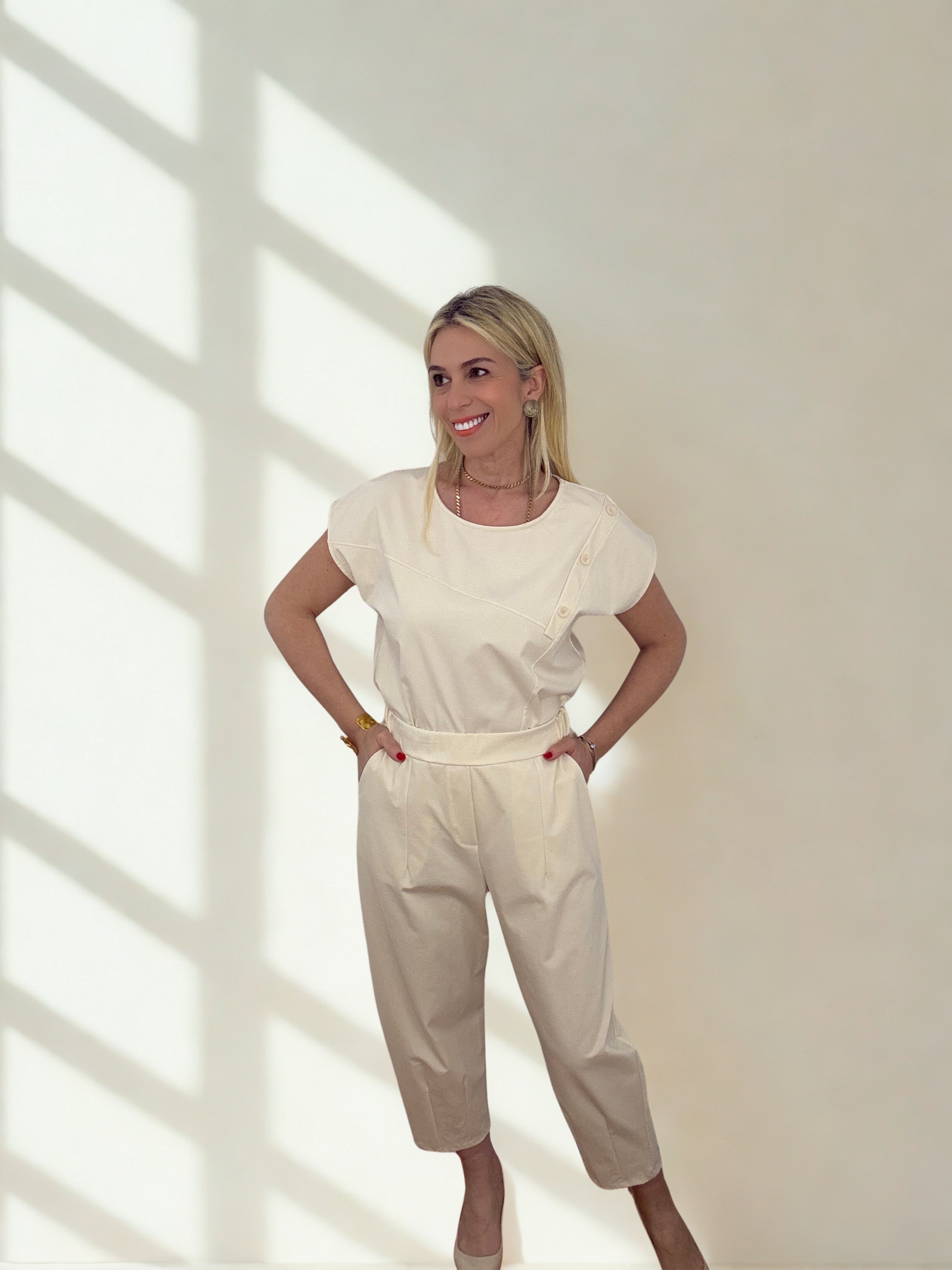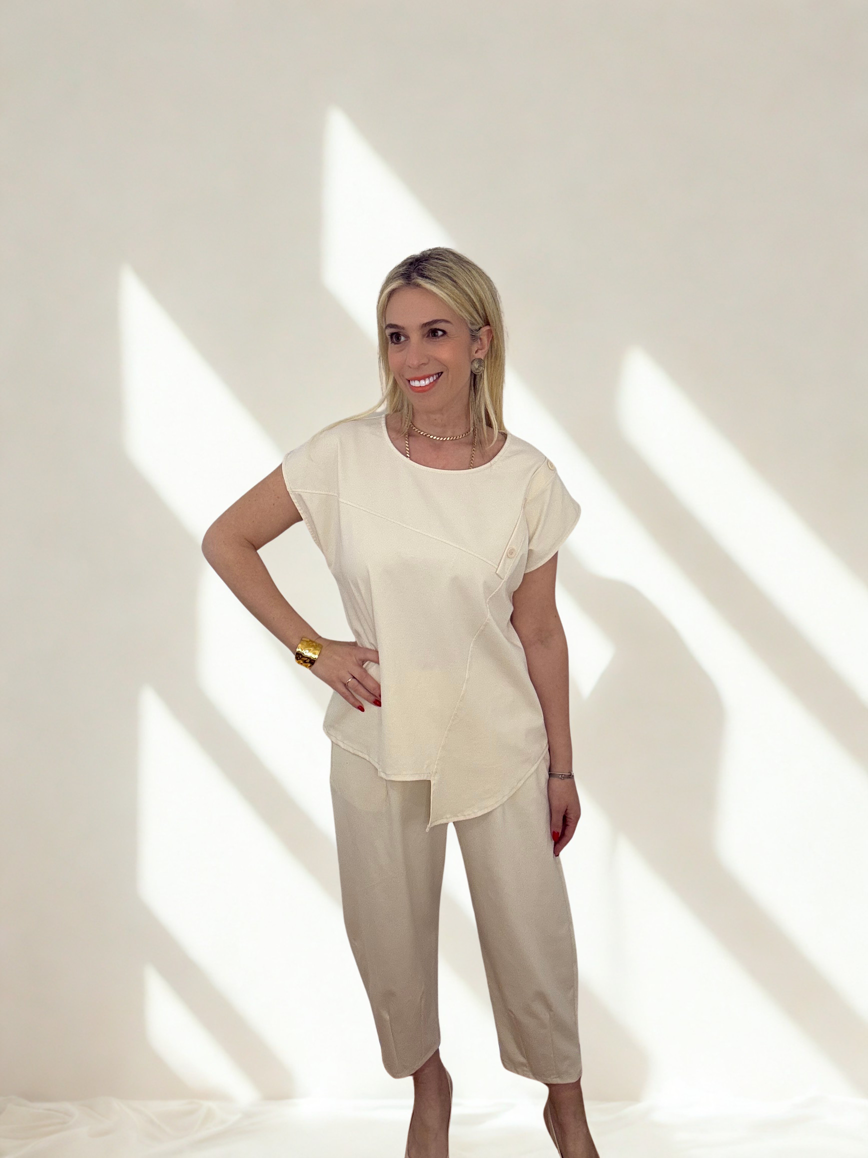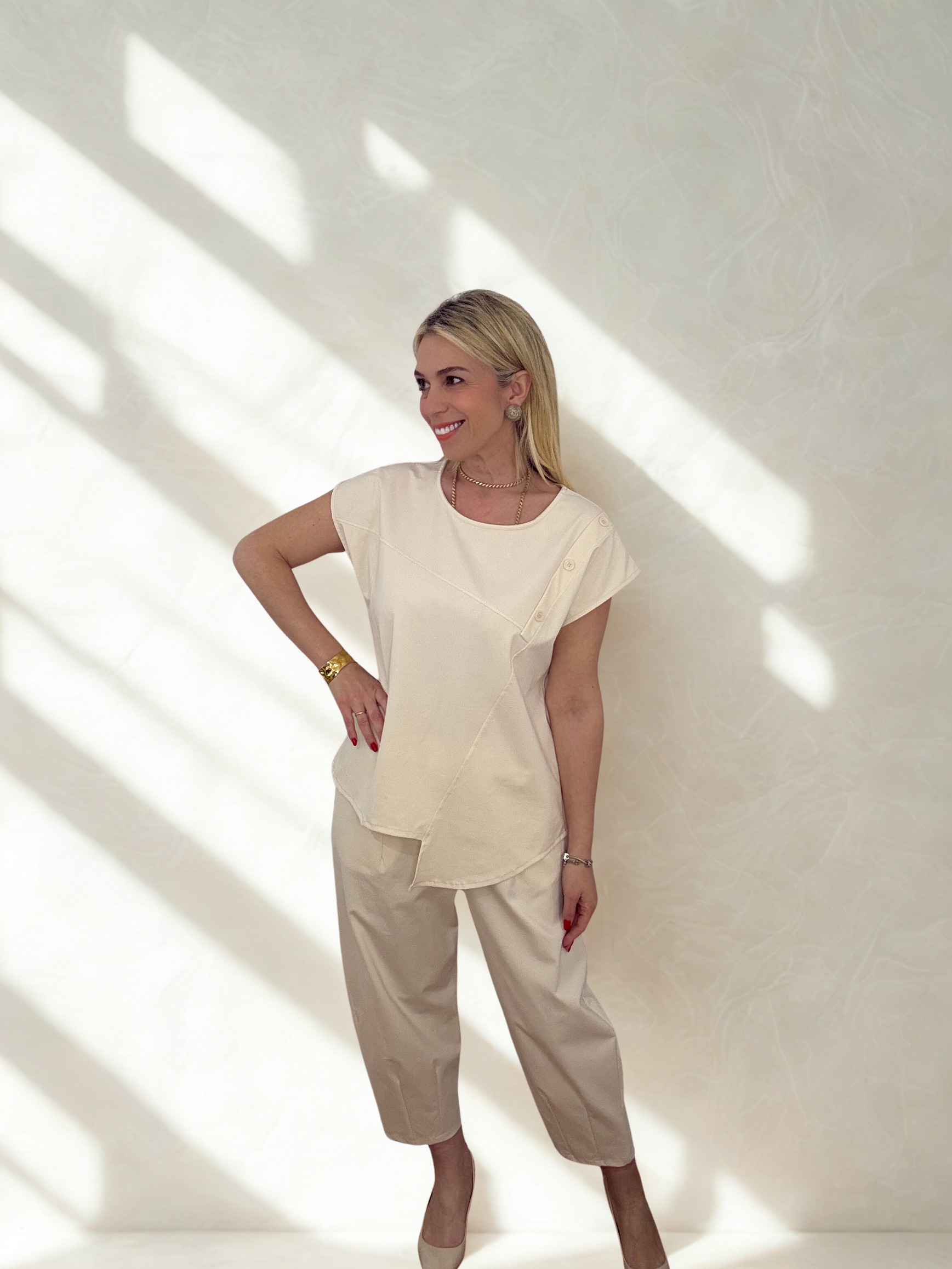 Minimal αισθητική και απόλυτη άνεση συνδυάζονται σε αυτό το κομψό σετ, ιδανικό για καθημερινές αλλά και πιο προσεγμένες εμφανίσεις. Η μπλούζα με τις διακριτικές ασύμμετρες λεπτομέρειες και τα κουμπιά στον ώμο δίνει μία μοντέρνα πινελιά, ενώ το παντελόνι με την άνετη γραμμή χαρίζει κομψότητα και ελευθερία κινήσεων.