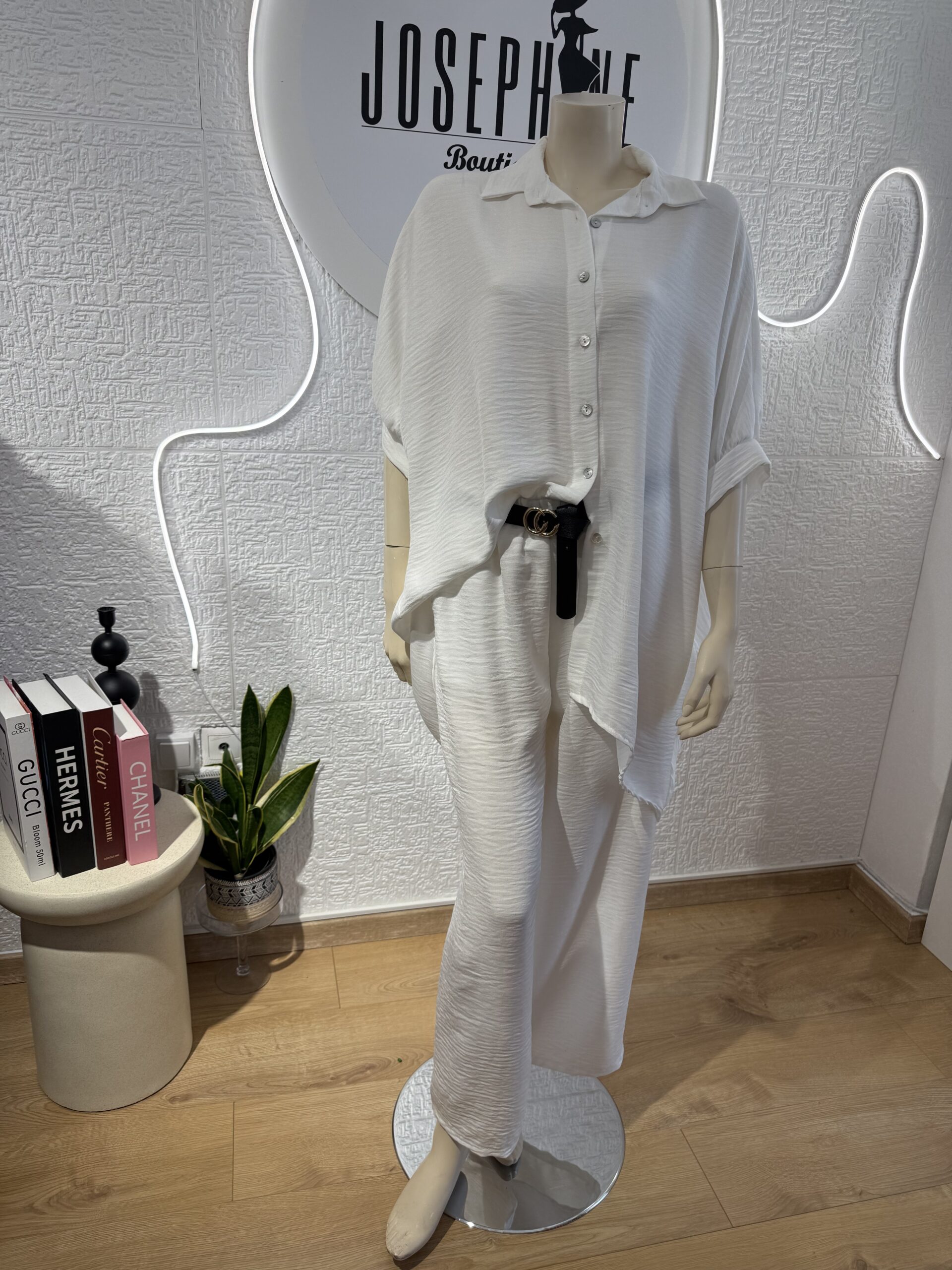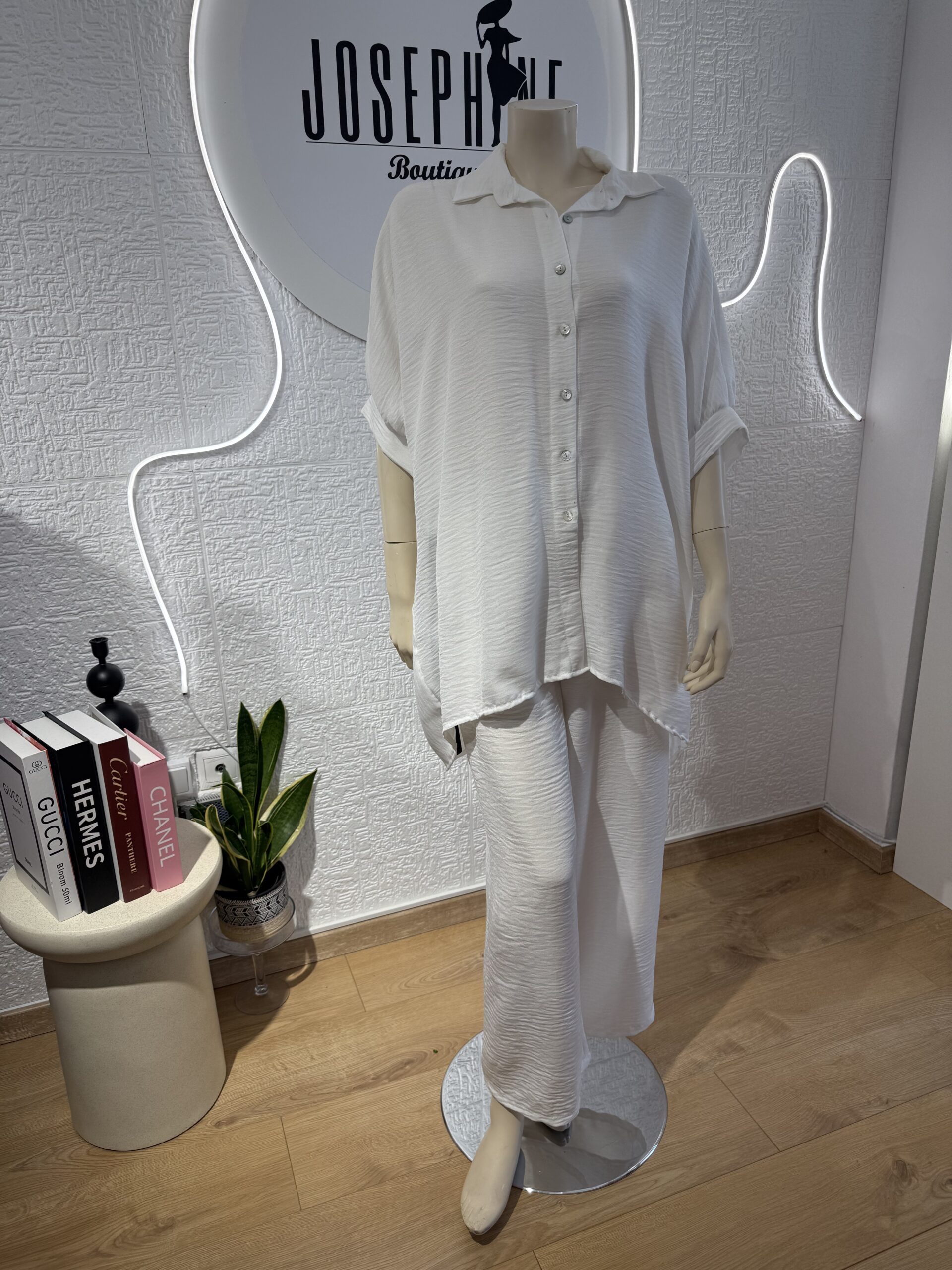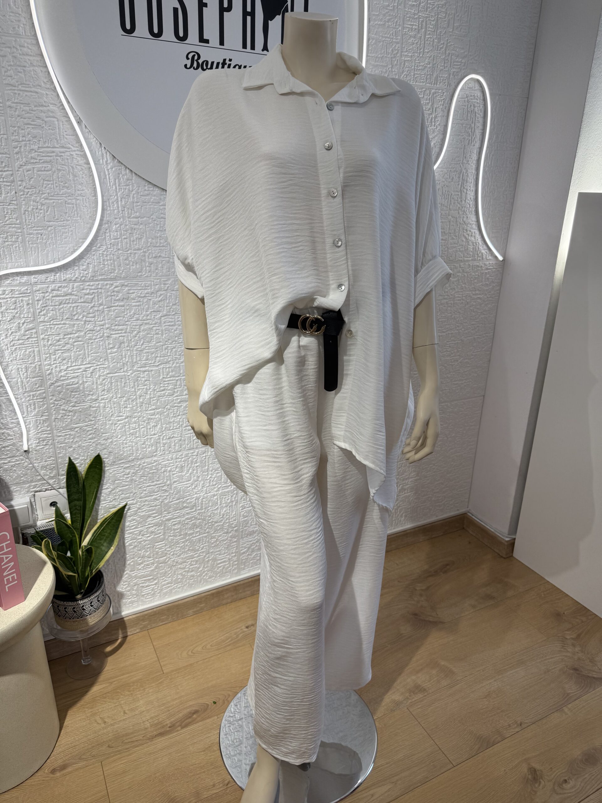 Ένα εντυπωσιακό αέρινο σετ κατάλληλο για τις καθημερινές εμφανίσεις σου. Αποτελείται από oversized πουκάμισο σε άνετη γραμμή που μπορεί να φορεθεί είτε κλειστό είτε ανοικτό και παντελόνι με άνετο λάστιχο στη μέση μαζί με δικό του ζωνάκι.