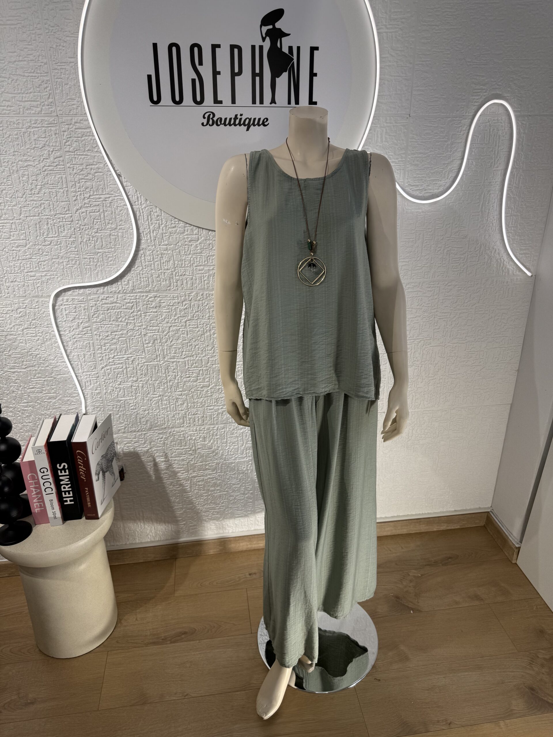 Δροσερό , άνετο , όμορφο καλοκαιρινό σετ. Αποτελείται από παντελόνι με άνετο λάστιχο και κορδόνι στη μέση και μία όμορφη μπλούζα σε ριχτή γραμμή, αμάνικη με στρόγγυλη λαιμόκοψη και ιδιαίτερο κόψιμο στο σημείο της πλάτης.