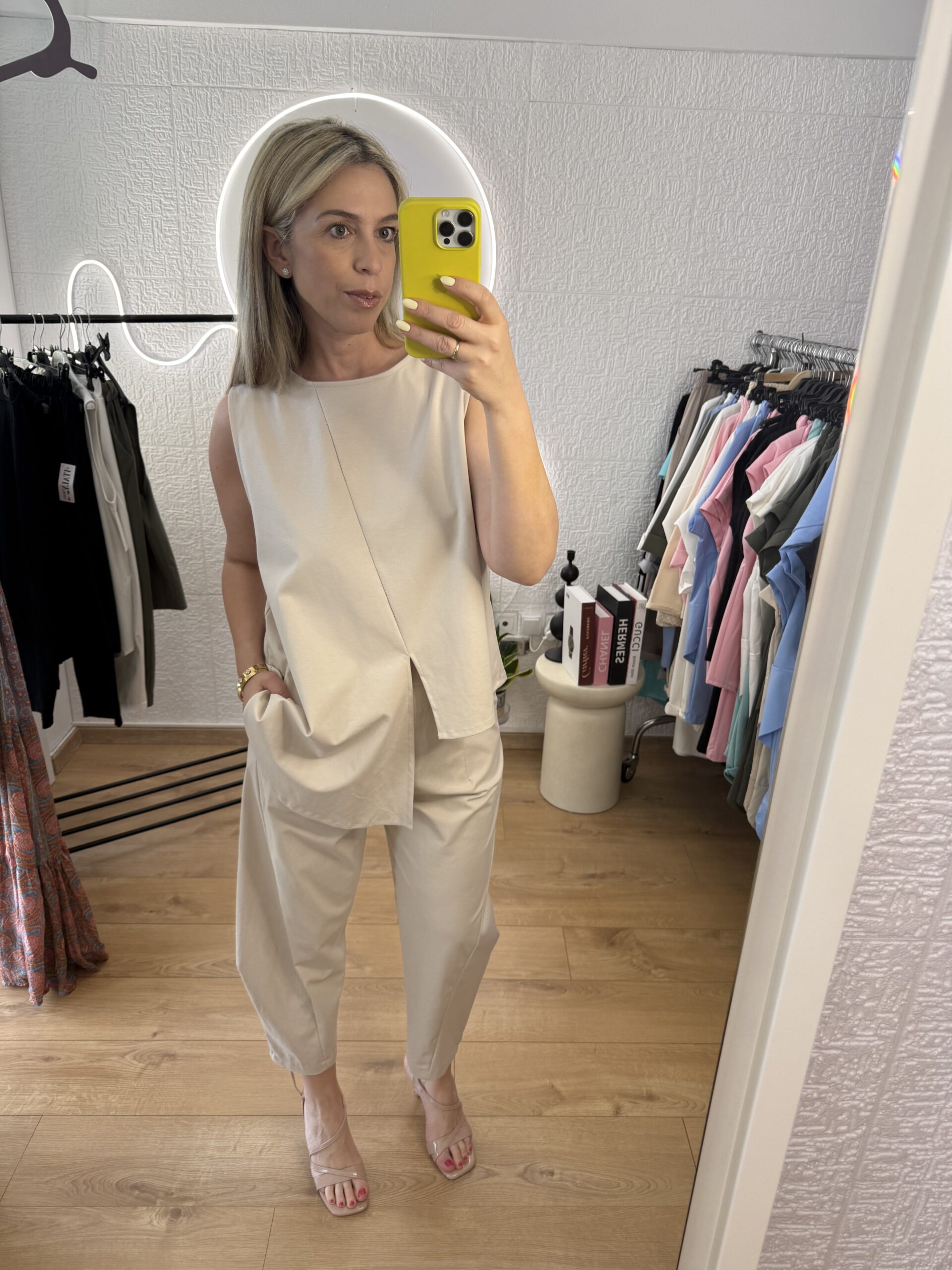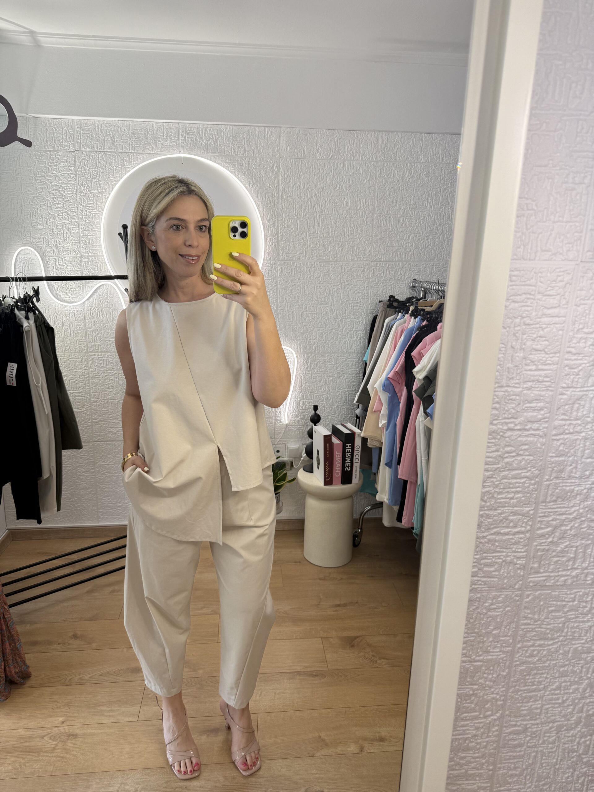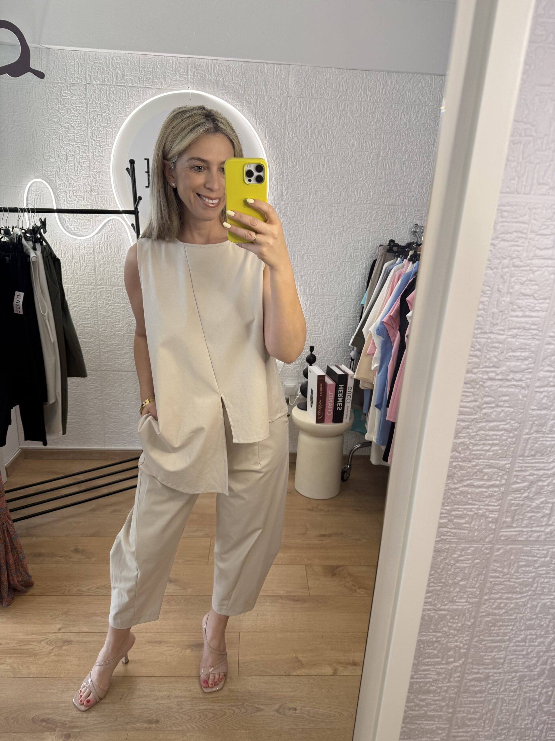 Υπέροχο καλοκαιρινό άνετο σετ για ένα ιδιαίτερο στυλ. Αμάνικο με χαλαρή μασχάλη που δεν πιέζει και εφαρμόζει άψογα. Κολακεύει κάθε σωματότυπο.